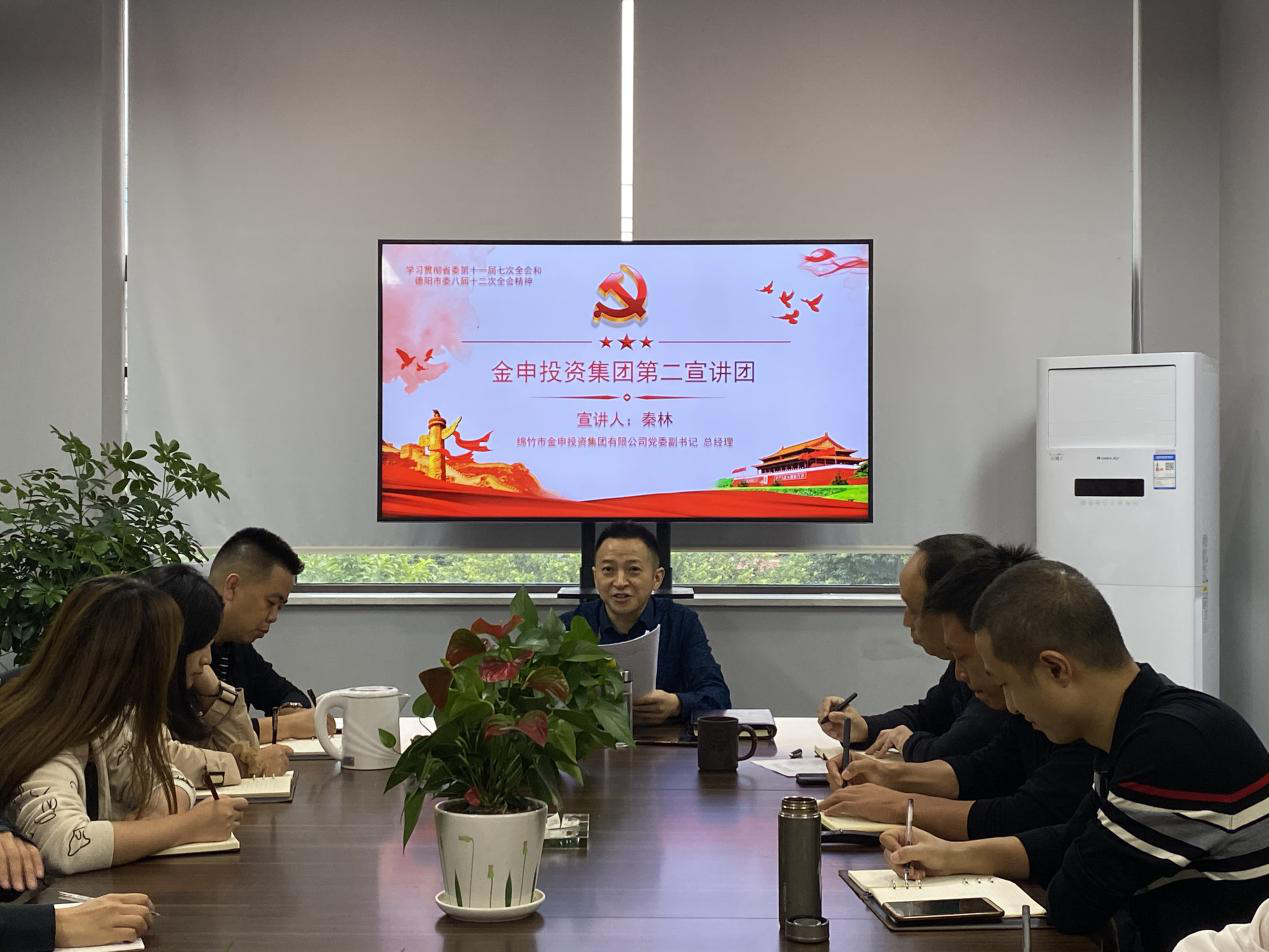 中共綿竹市金申投資集團有限公司委員會(huì )按照綿竹市委的統一要求,開(kāi)展學(xué)習貫徹省委十一屆七次全會(huì )和德陽(yáng)市委八屆十二次全體會(huì )議精神宣講。本次宣講共組建6支宣講隊伍,由黨委領(lǐng)導班子帶隊分別到6個(gè)黨支部進(jìn)行宣講,做到公司黨員全覆蓋。