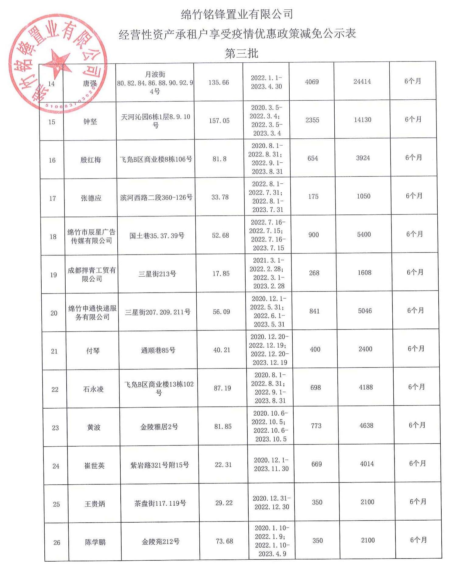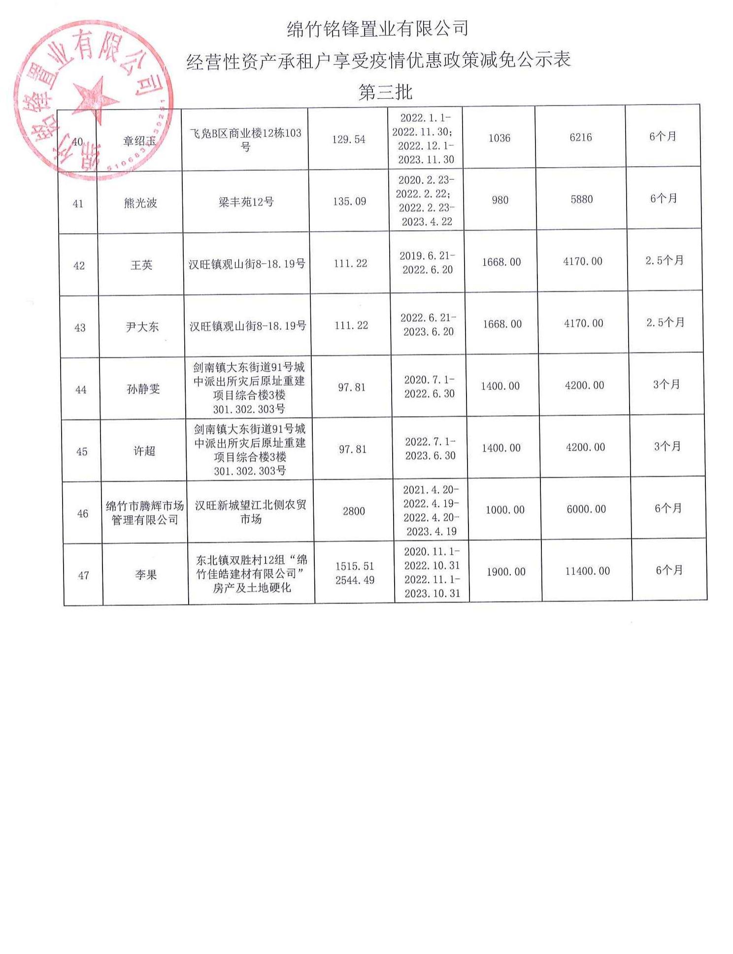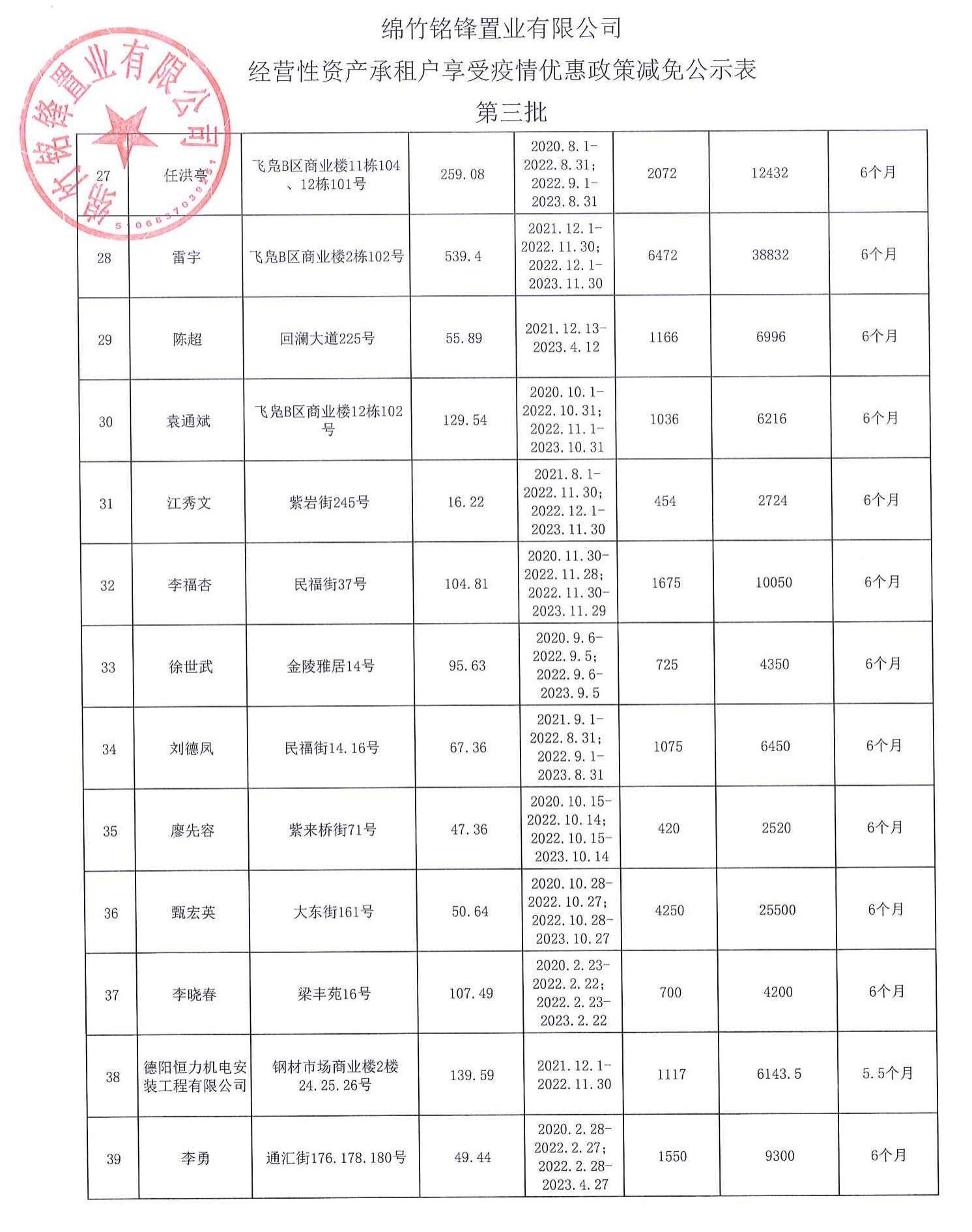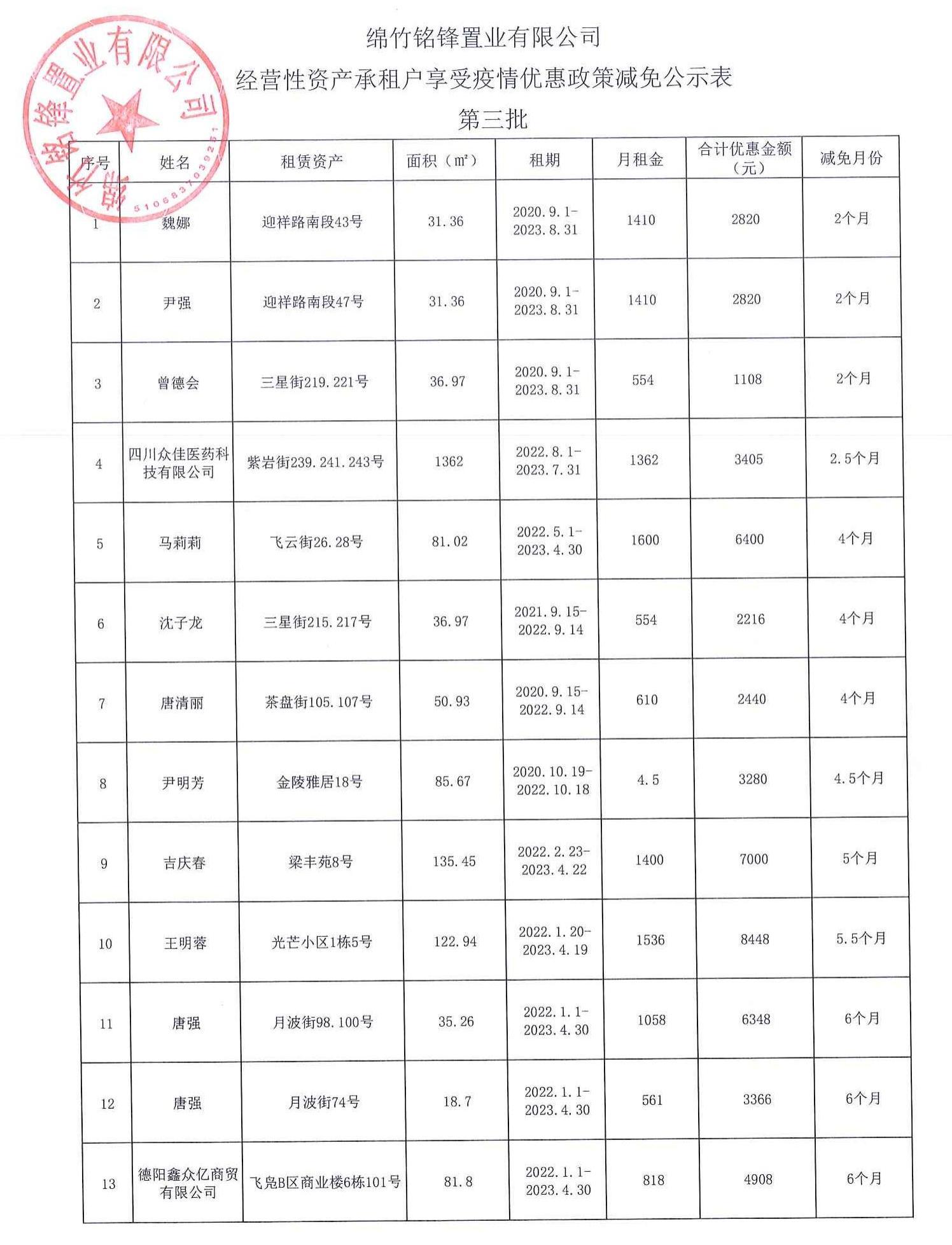 經(jīng)營(yíng)性資產(chǎn)承租戶(hù)享受疫情優(yōu)惠政策減免公示表(第三批)
