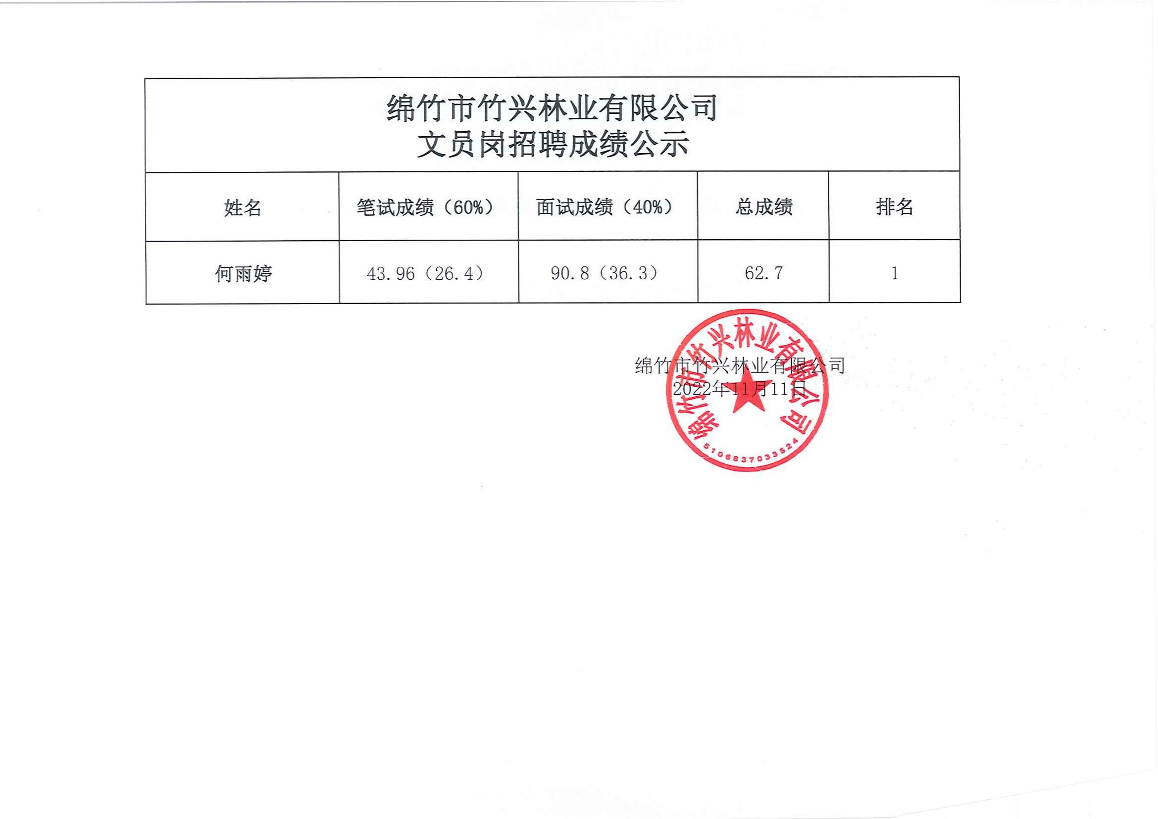 綿竹市竹興林業(yè)有限公司關(guān)于2022年公開(kāi)招聘成績(jì)公示