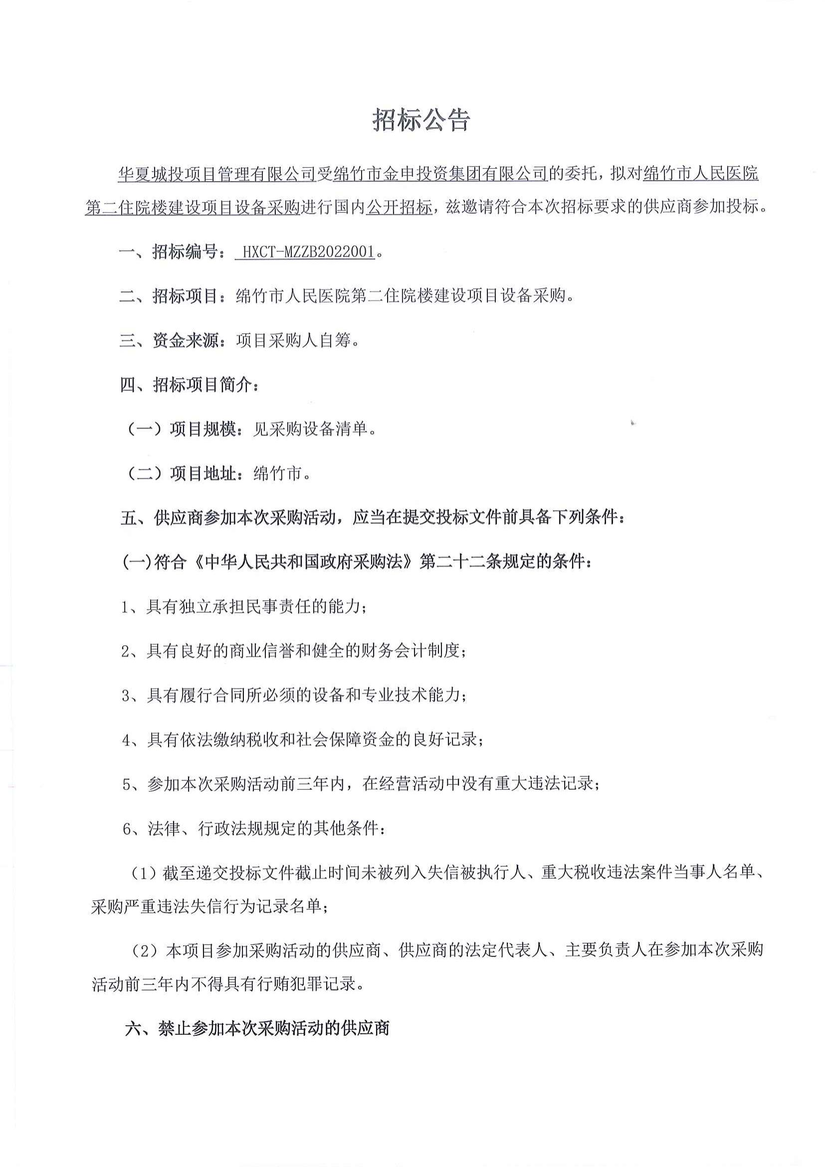 綿竹市人民醫院第二住院樓建設項目設備采購招標公告