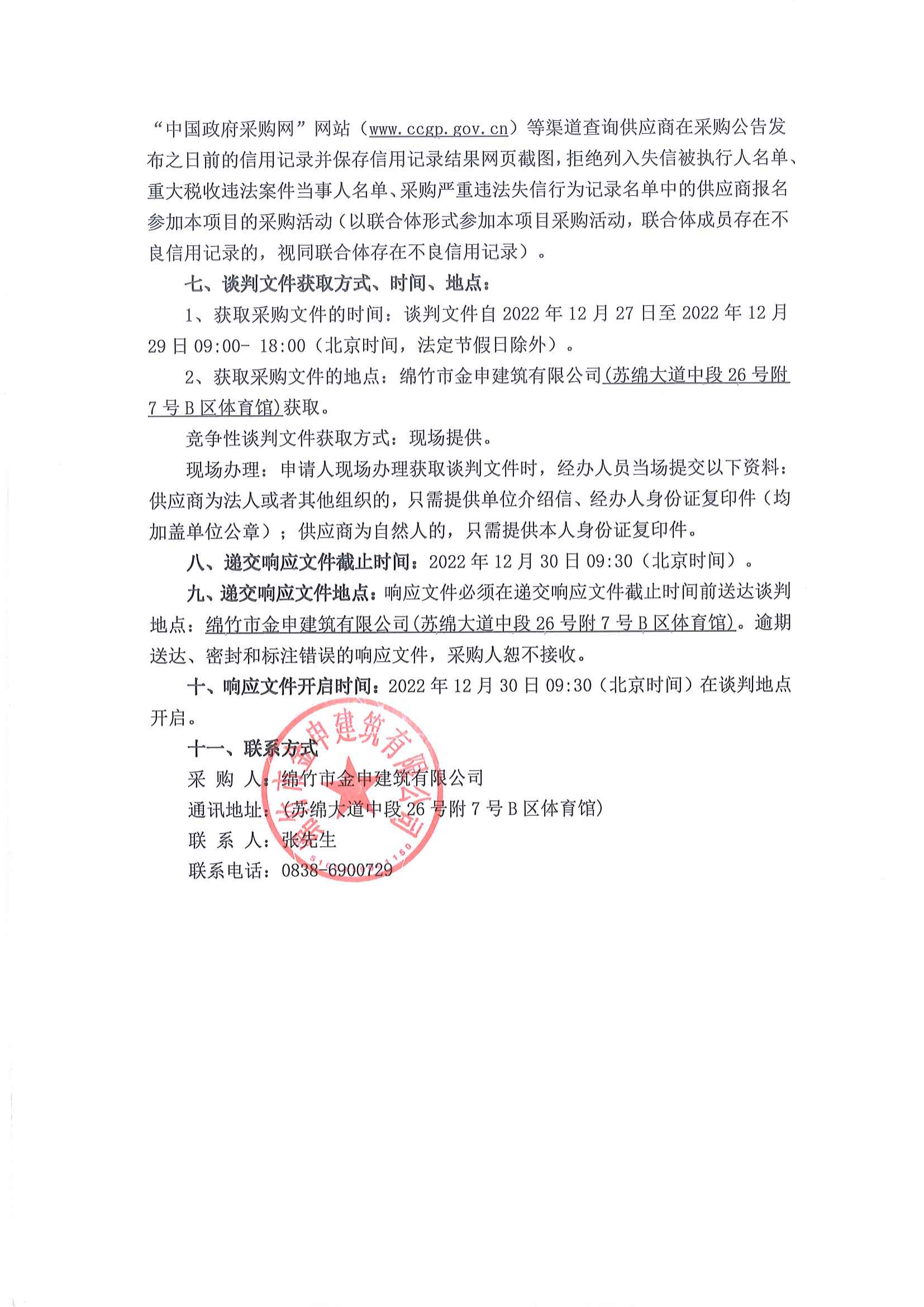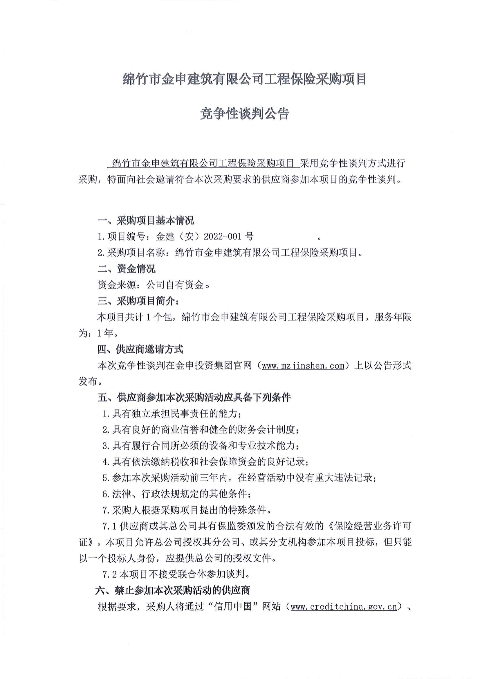 綿竹市金申建筑有限公司工程保險采購項目競爭性談判公告