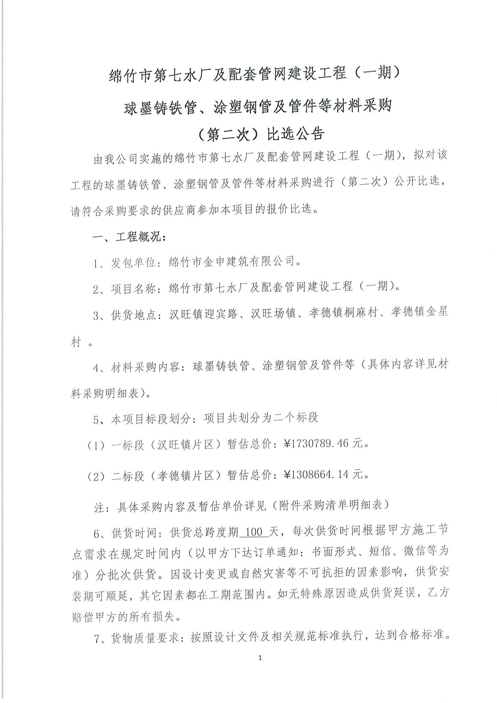 綿竹市第七水廠(chǎng)及配套管網(wǎng)建設工程(一期)材料采購比選公告