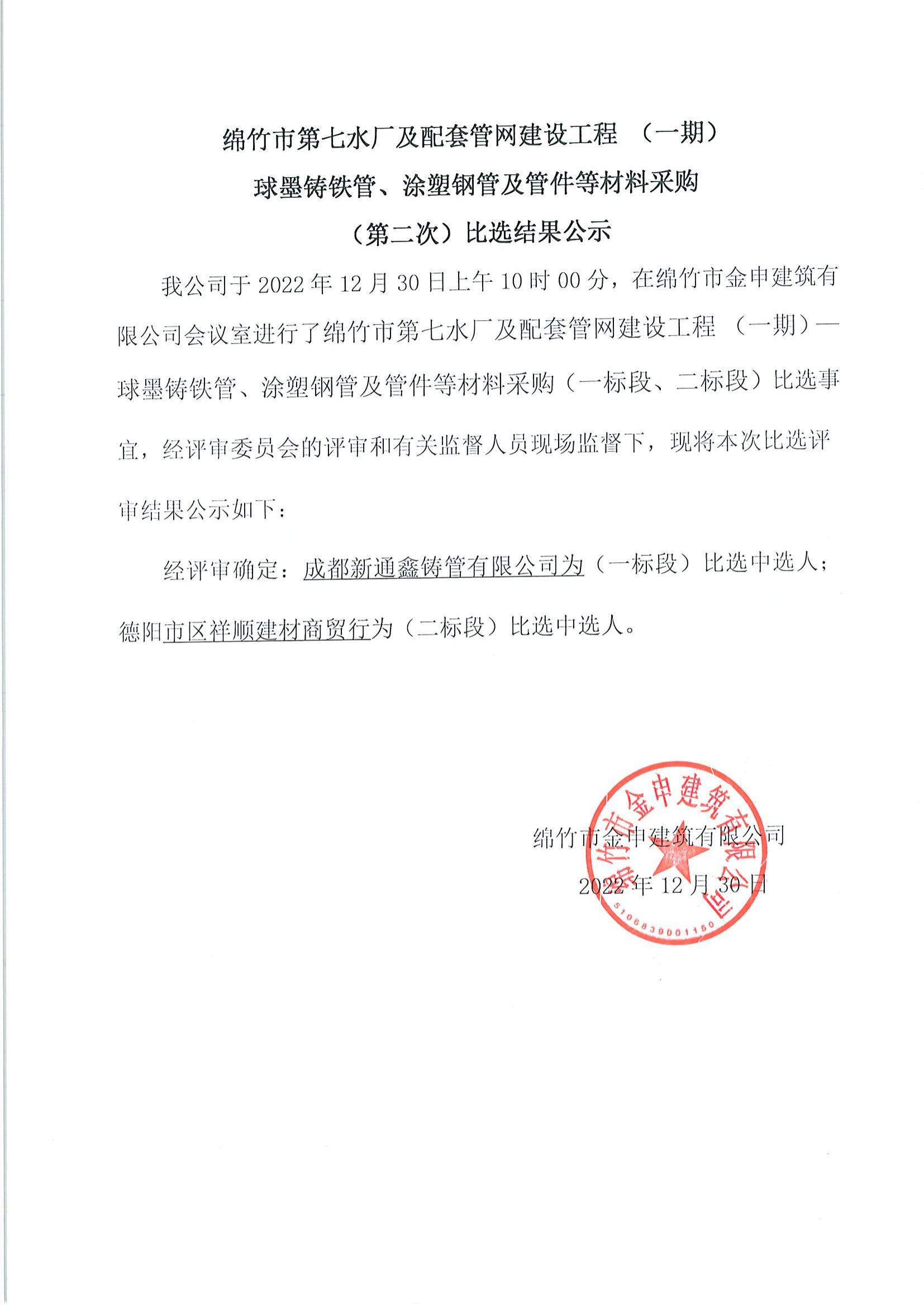 綿竹第七水廠(chǎng)配套管網(wǎng)建設工程一期第二次比選結果公示