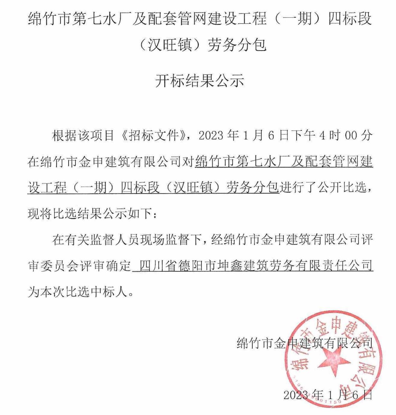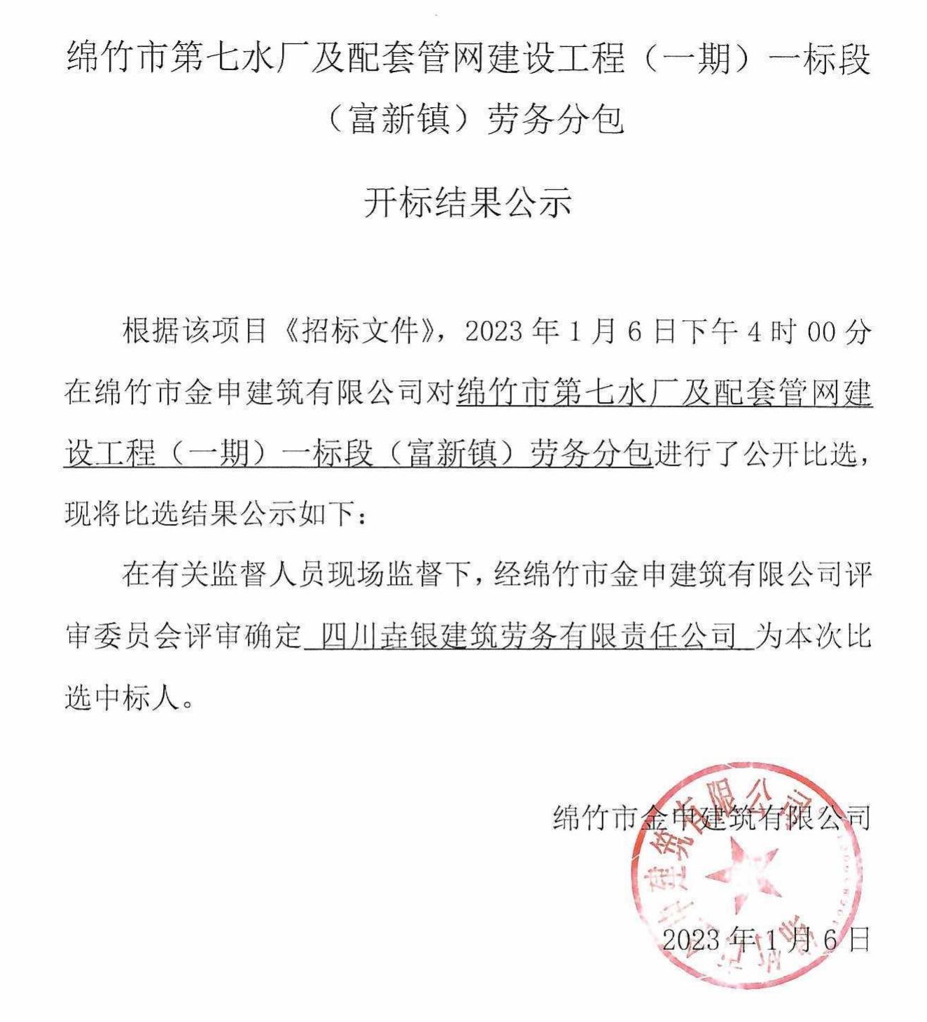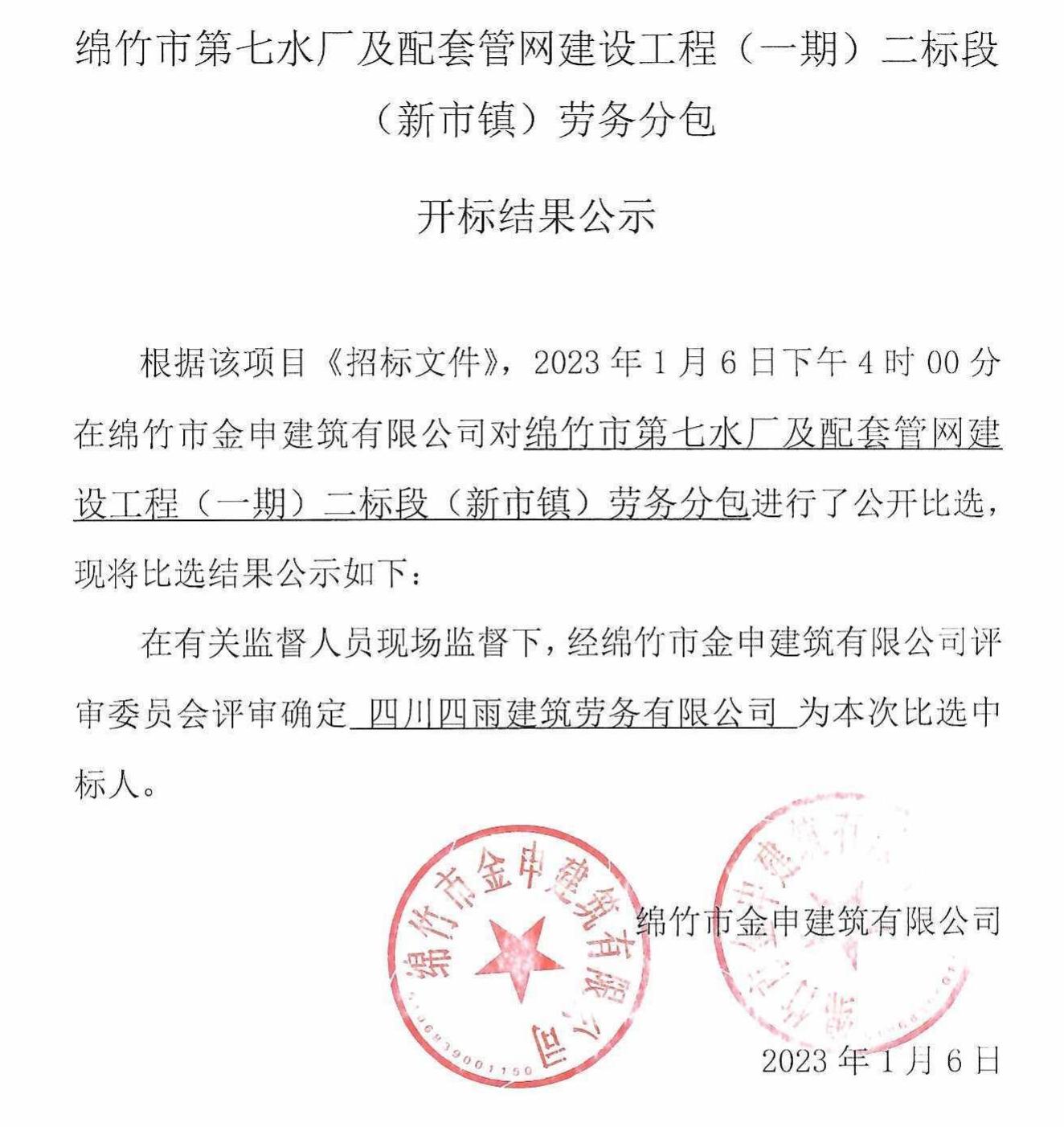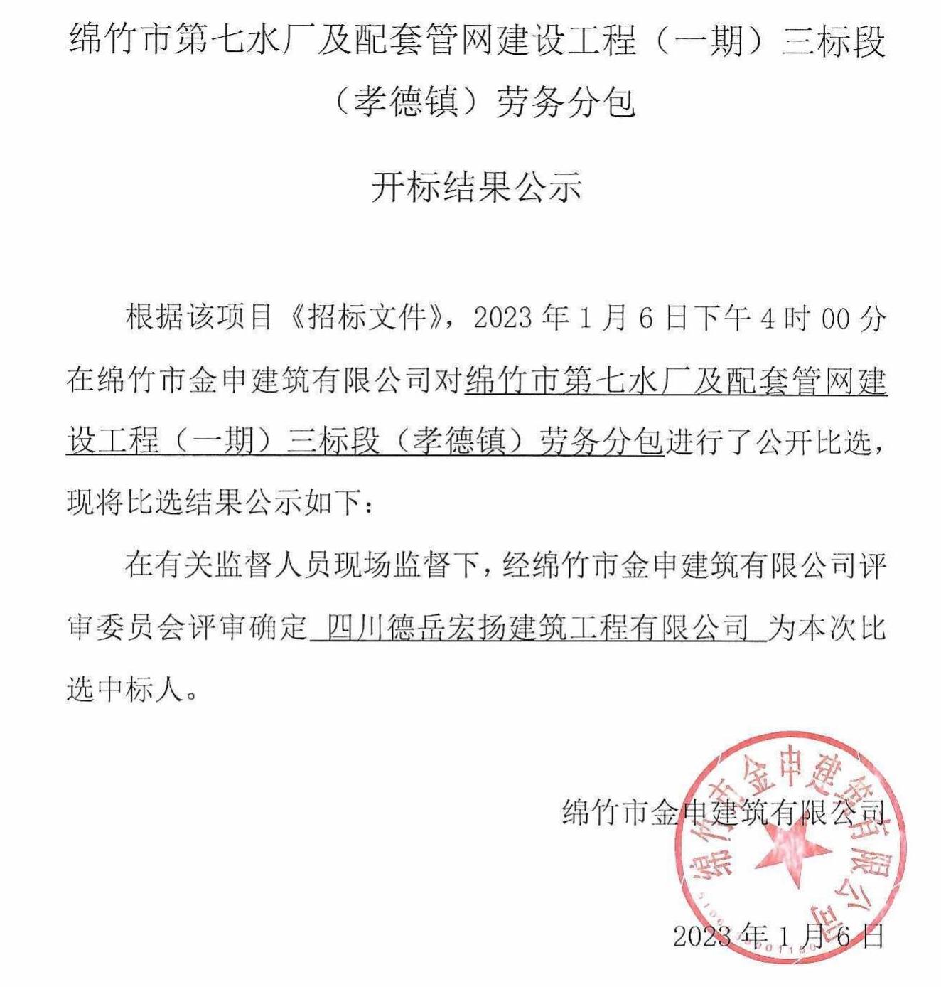 綿竹第七水廠(chǎng)配套管網(wǎng)建設(一期)勞務(wù)分包比選結果公示