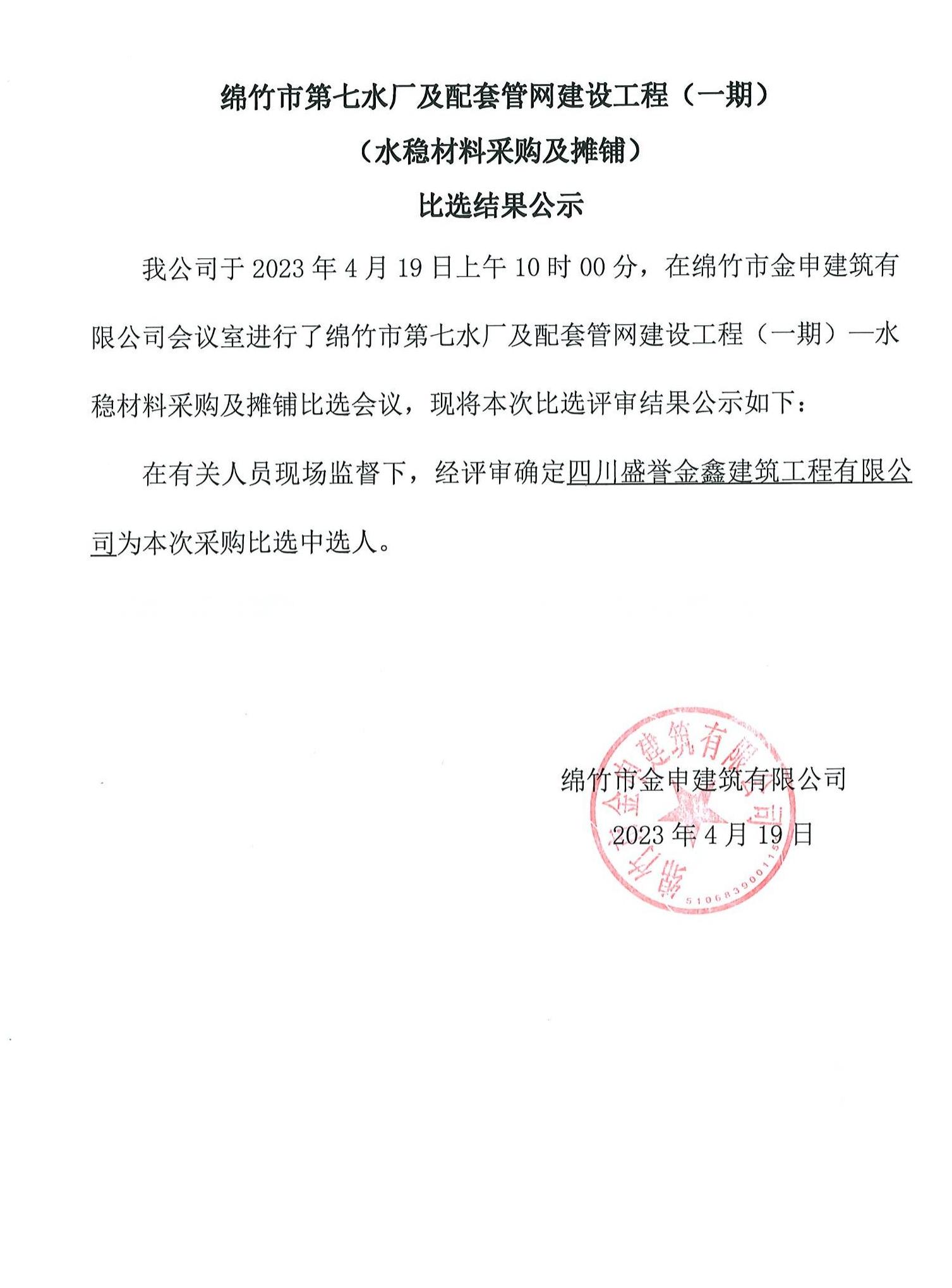 綿竹第七水廠(chǎng)配套管網(wǎng)建設項目水穩材料采購比選結果公示