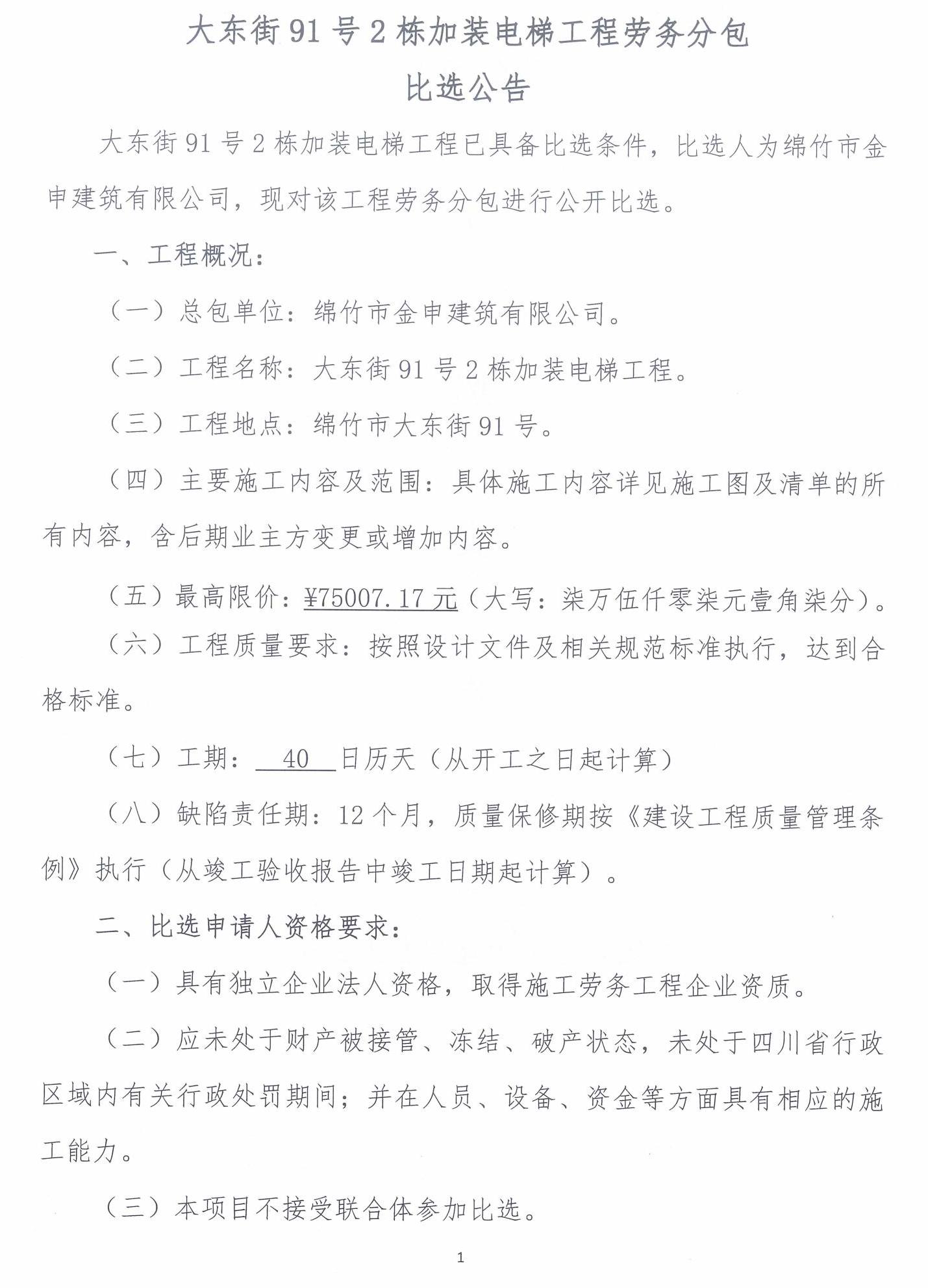 大東街91號2棟加裝電梯工程勞務(wù)分包比選公告