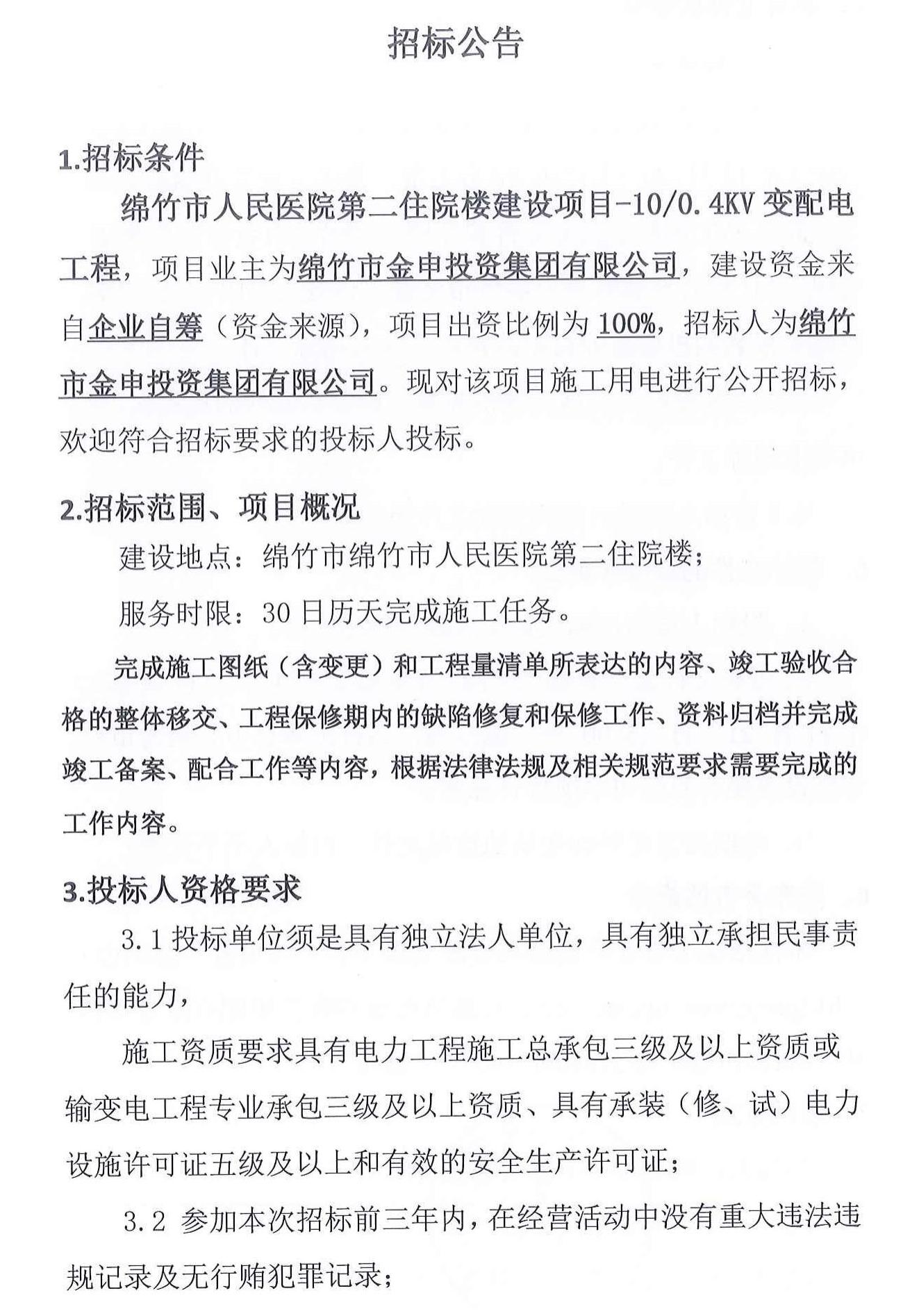 綿竹市人民醫院第二住院樓建設項目變配電工程招標公告