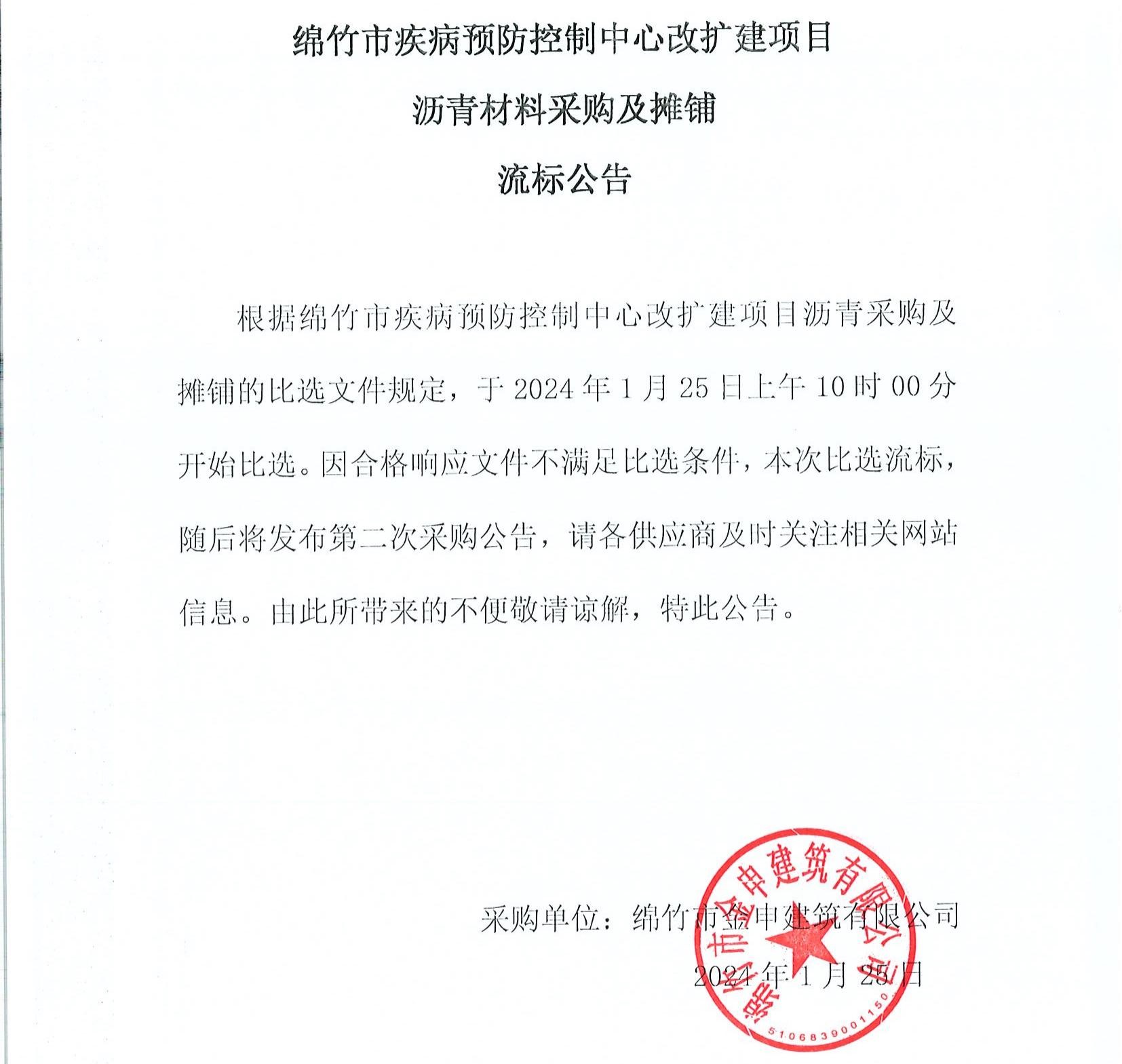 綿竹市疾病預防控制中心改擴建項目瀝青材料采購流標公告