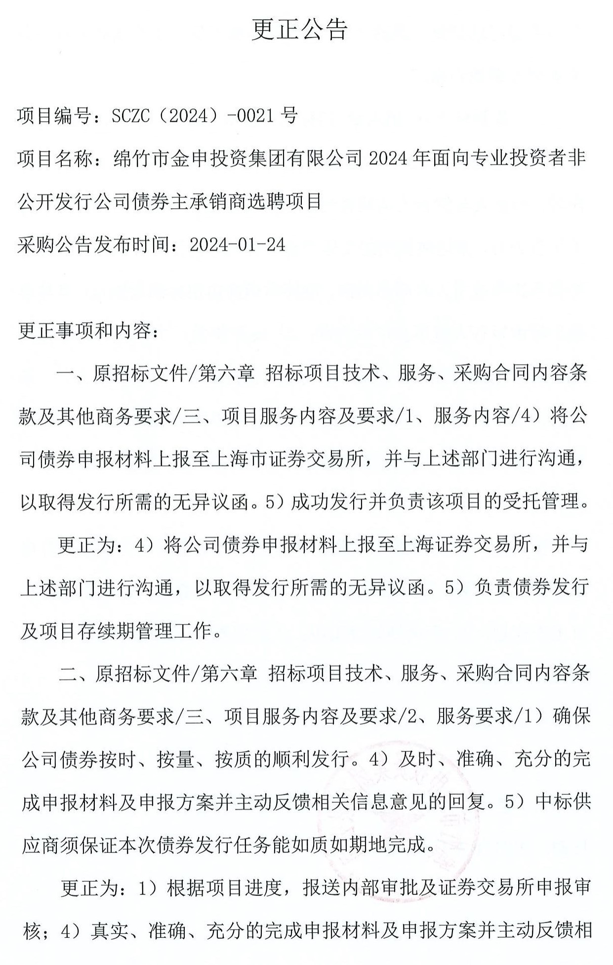 金申集團公司非公開(kāi)發(fā)行公司債券主承銷(xiāo)商選聘更正公告