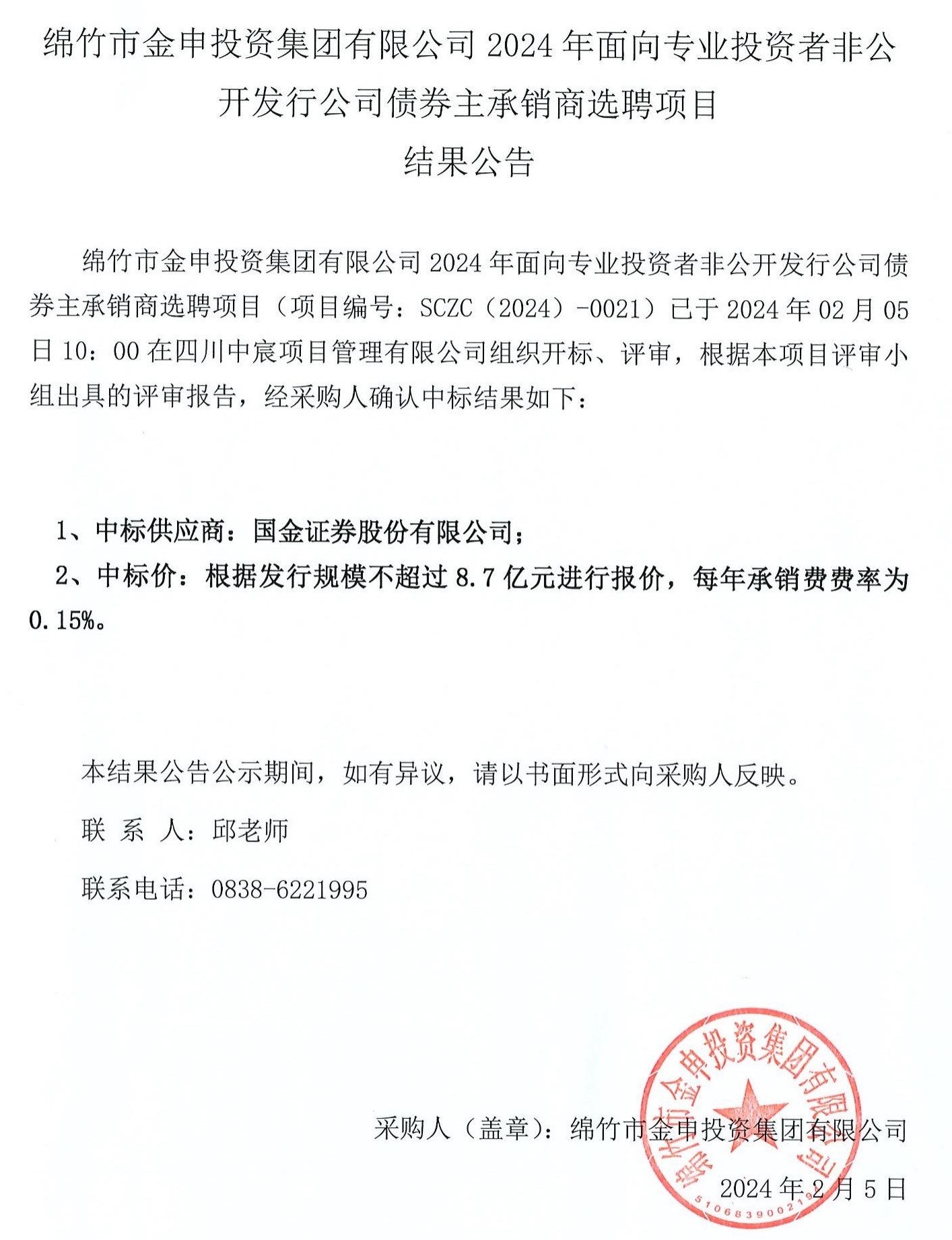 金申集團公司非公開(kāi)發(fā)行公司債券主承銷(xiāo)商選聘結果公示