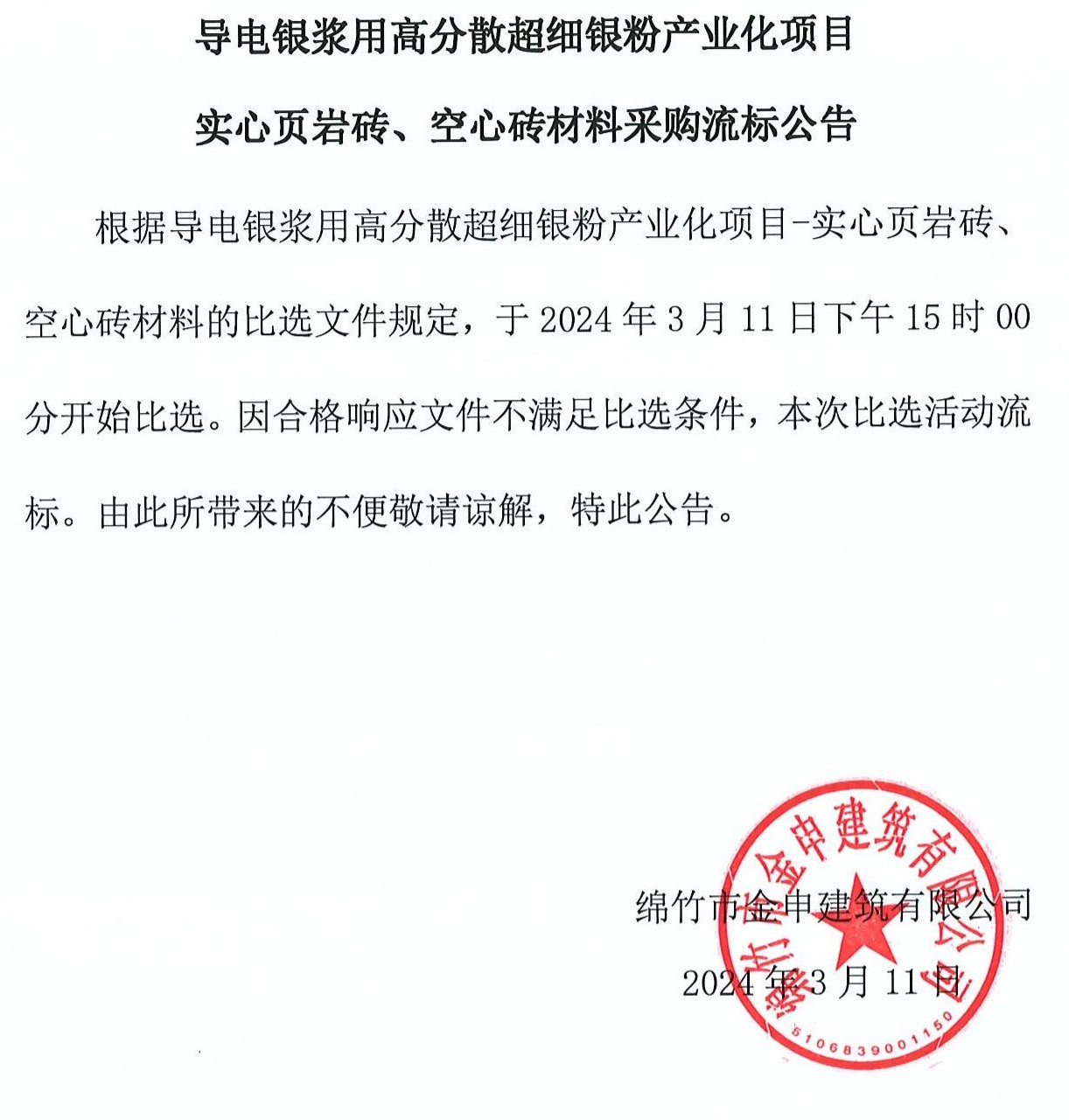 導電銀漿用高分散超細銀粉項目頁(yè)巖磚、空心磚流標公告