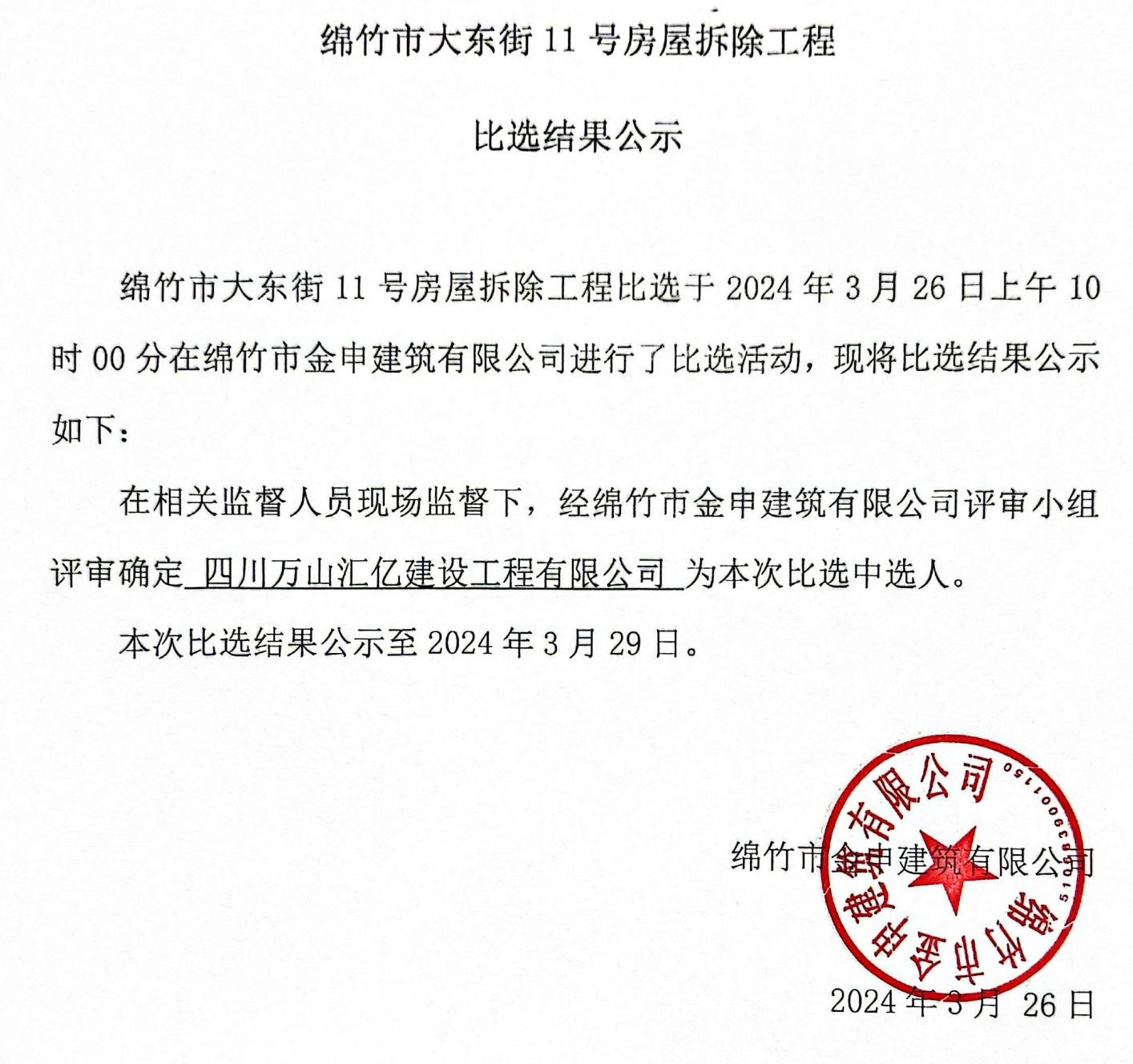 綿竹市大東街 11 號房屋拆除工程比選結果公示