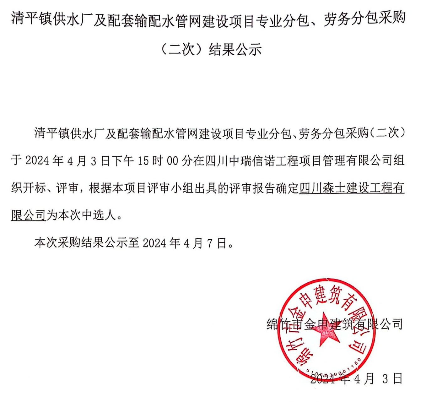 清平水廠(chǎng)配套管網(wǎng)項目分包、勞務(wù)分包(二次)結果公示