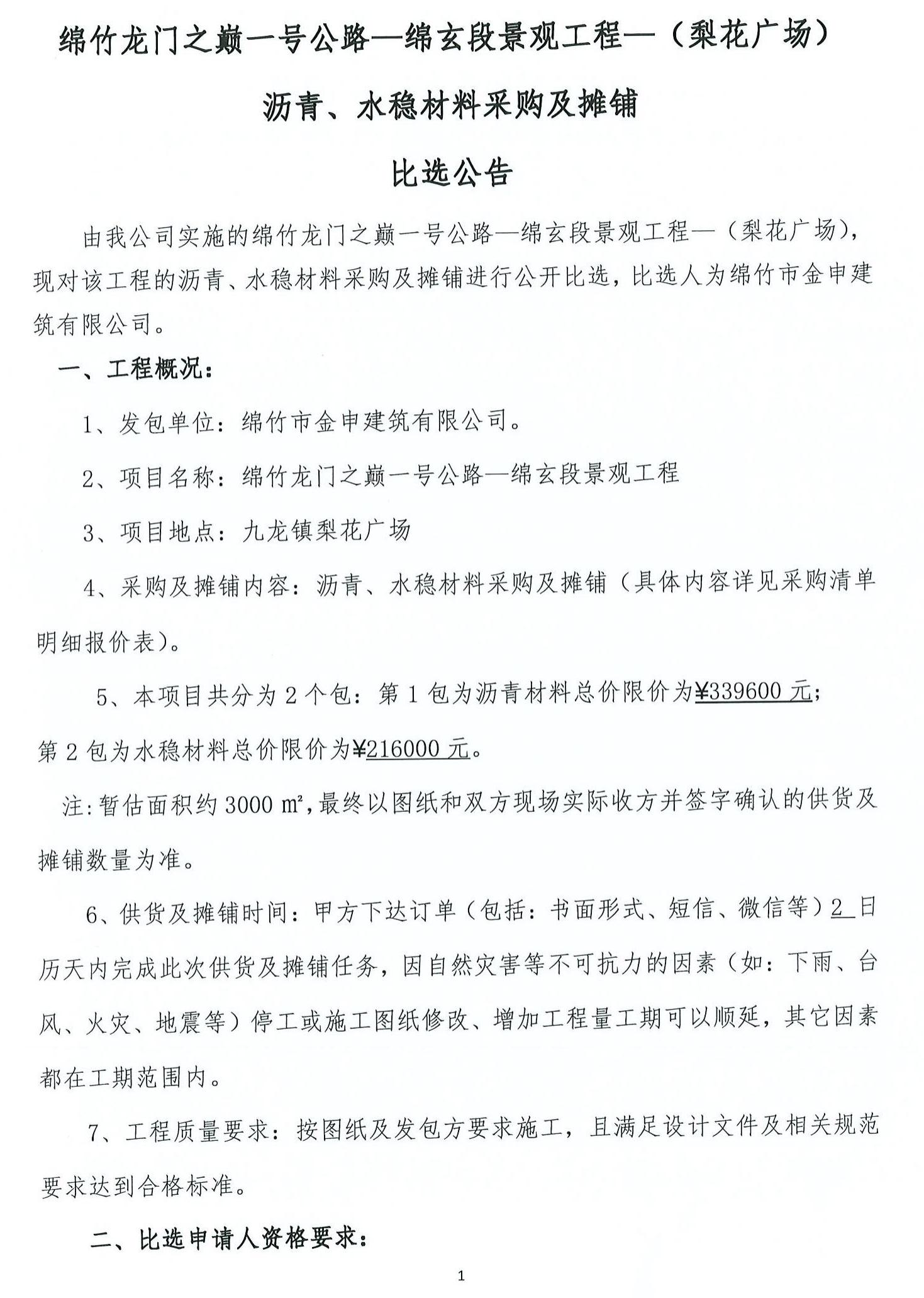 龍門(mén)之巔一號公路綿玄段(梨花廣場(chǎng))瀝青、水穩比選公告