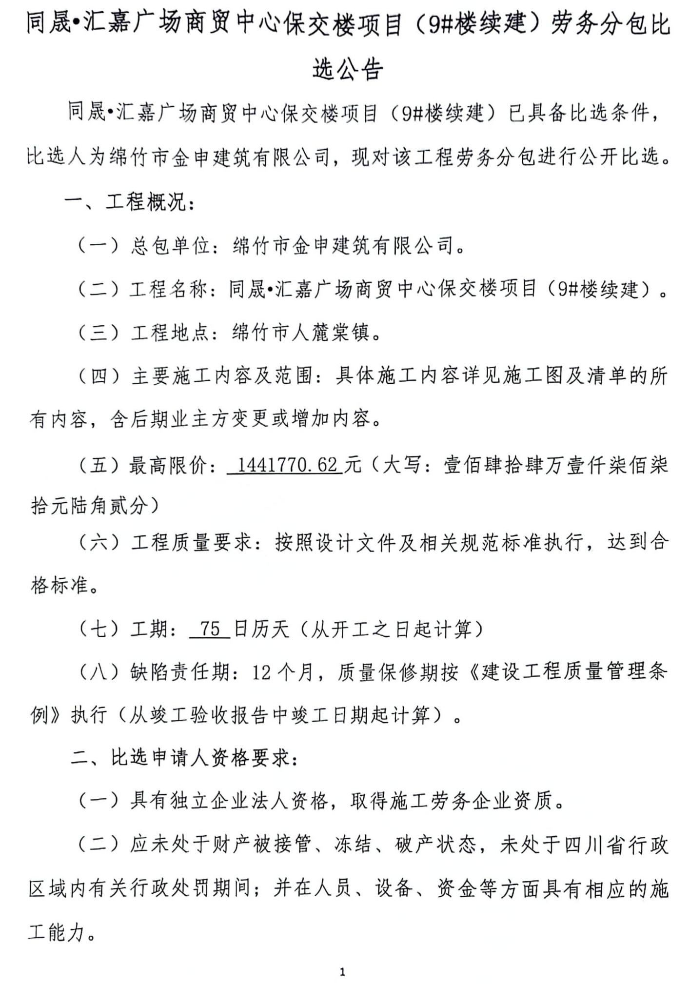 同晟·匯嘉廣場(chǎng)商貿中心保交樓(9#樓續建)勞務(wù)比選公告