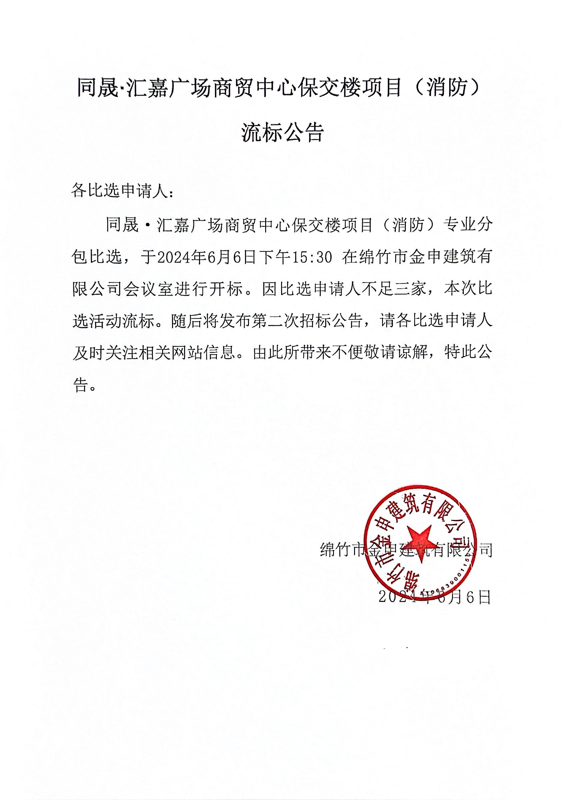同晟·匯嘉廣場(chǎng)商貿中心保交樓項目(消防) 流標公告
