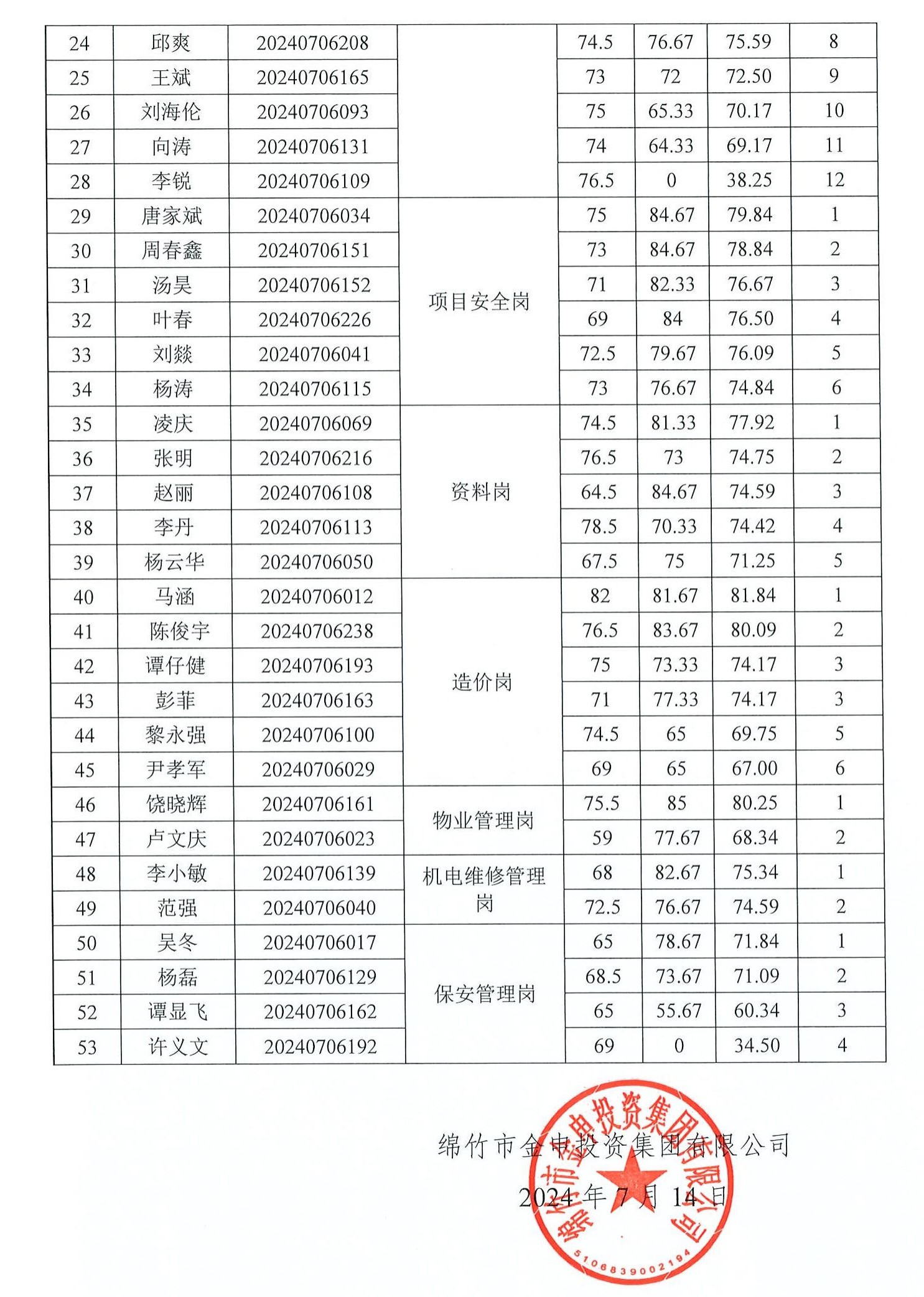 金申集團2024年度公開(kāi)招聘專(zhuān)業(yè)技術(shù)人員總成績(jì)及排名公告