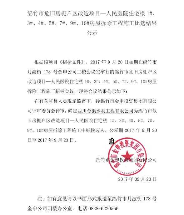 人民醫院住宅樓房屋拆除工程施工比選結果公示