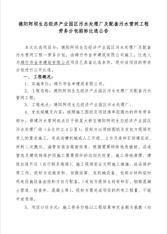 德阿污水處理廠(chǎng)及配套污水管網(wǎng)工程勞務(wù)分包招標比選公告