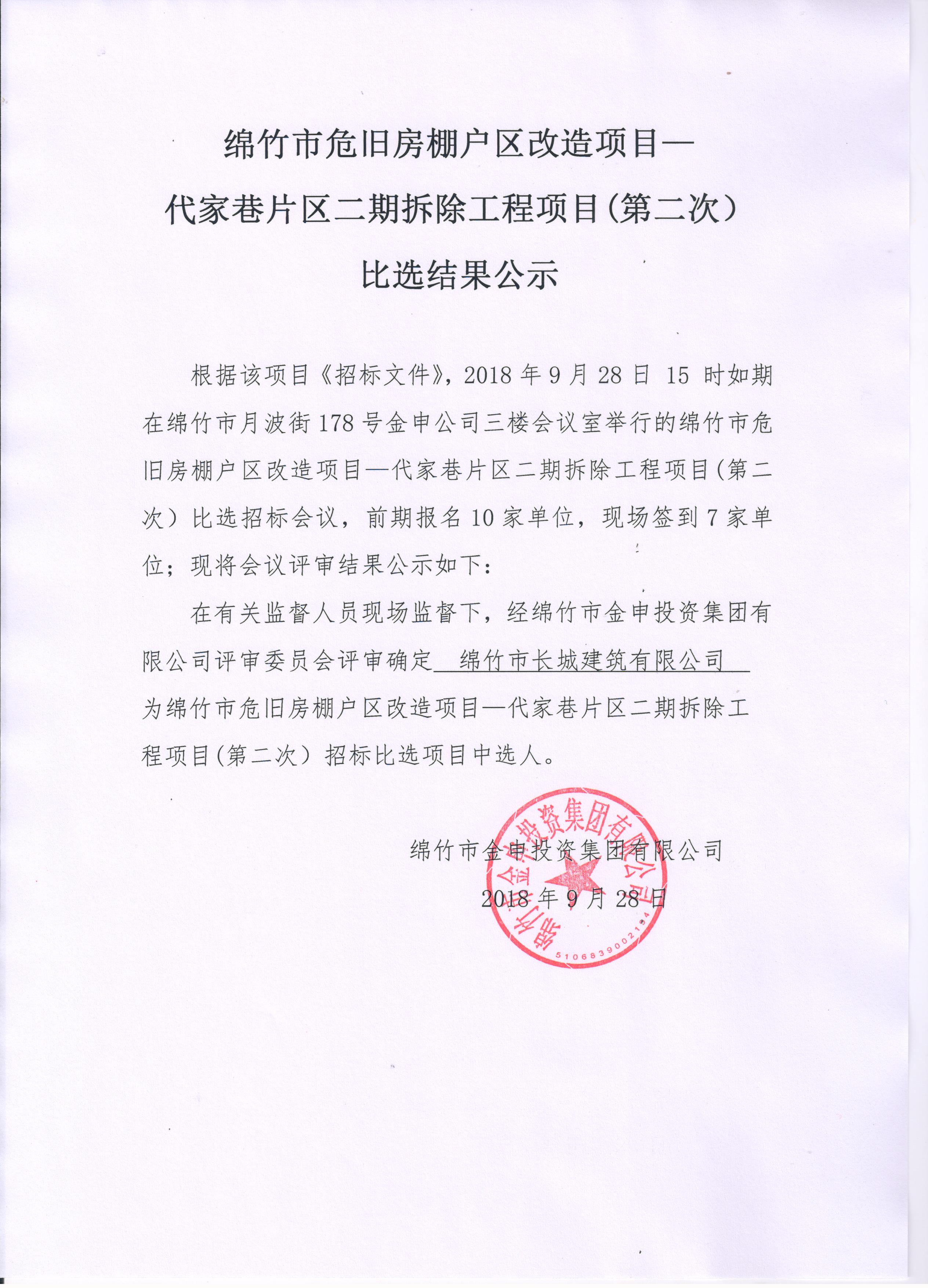 代家巷片區二期拆除工程項目(第二次)比選結果公示