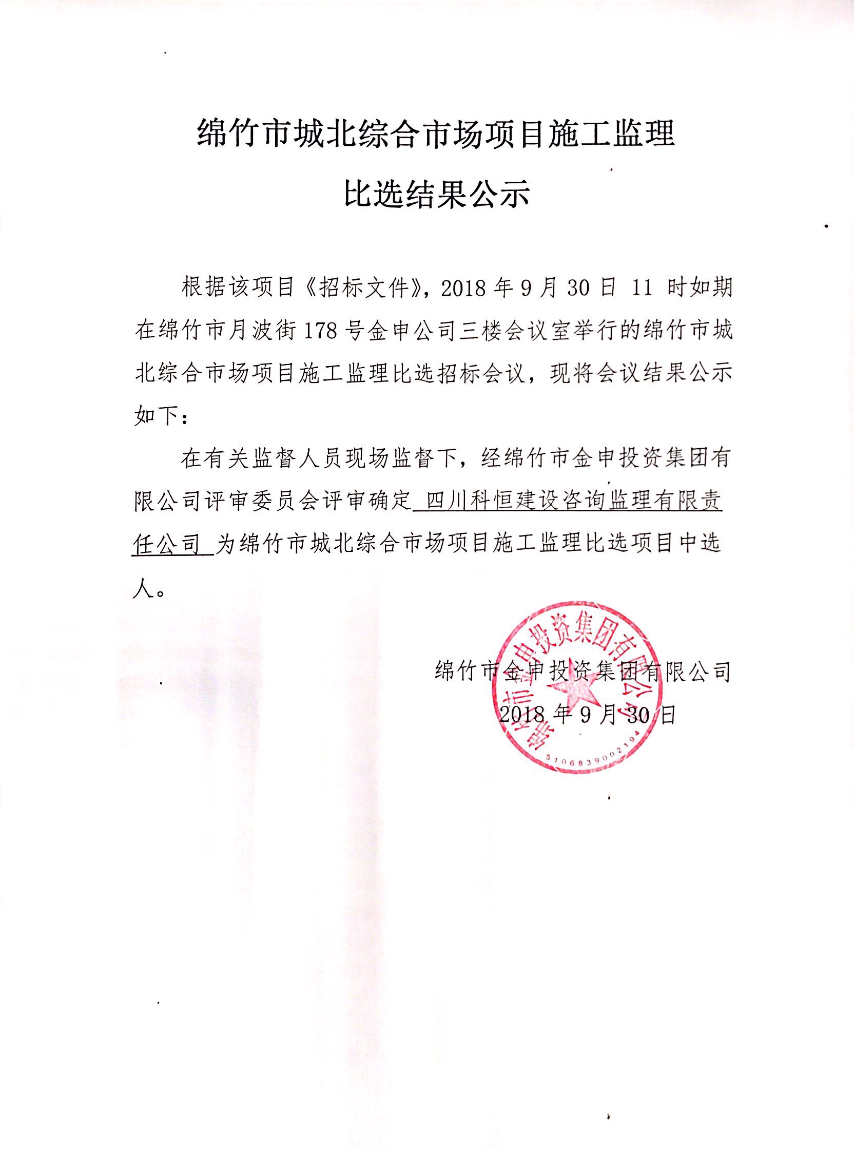 城北綜合市場(chǎng)項目施工監理比選結果公示