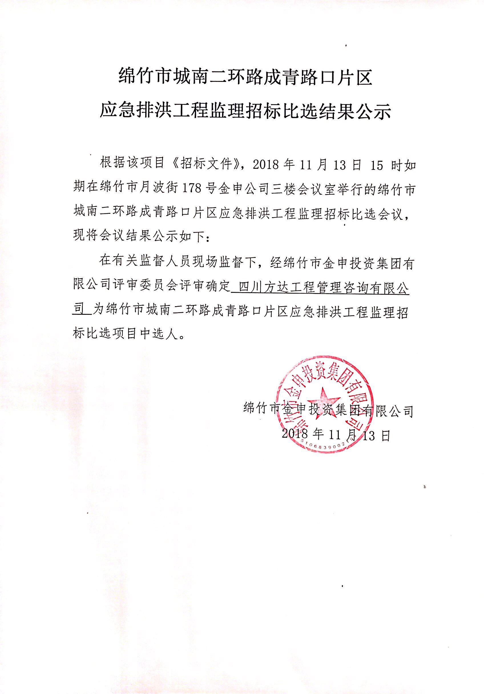 市成青路口片區應急排洪工程監理招標比選結果公示
