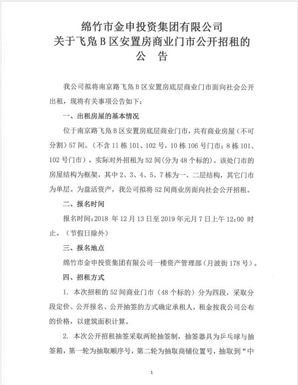 關(guān)于飛鳧B區安置房商業(yè)門(mén)市公開(kāi)招租的公告