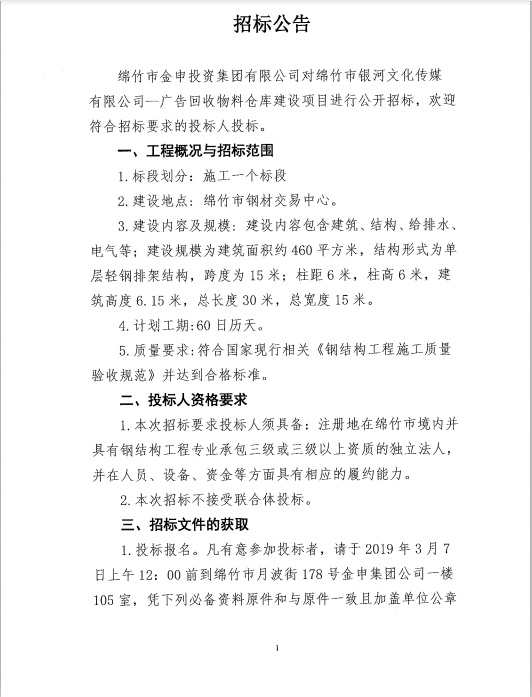 金申集團對銀河傳媒廣告回收物料倉庫建設項目招標公告