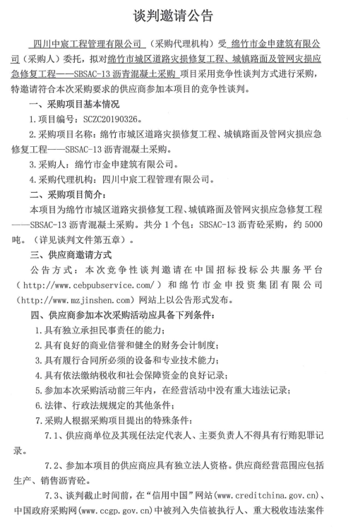關(guān)于綿竹城區災損修復工程瀝青混泥土采購的談判邀請公告