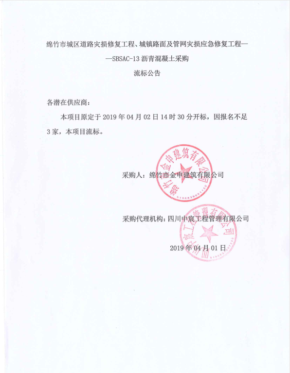 市城區道路災損等修復工程—SBSAC-13瀝青混凝土采購流標公告