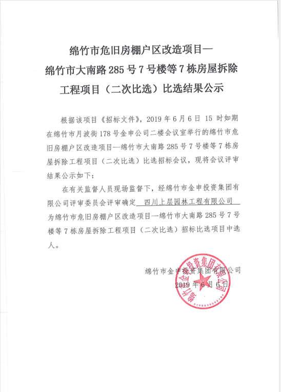 市大南路285號7號樓等7棟房屋拆除項目第二次比選結果公示