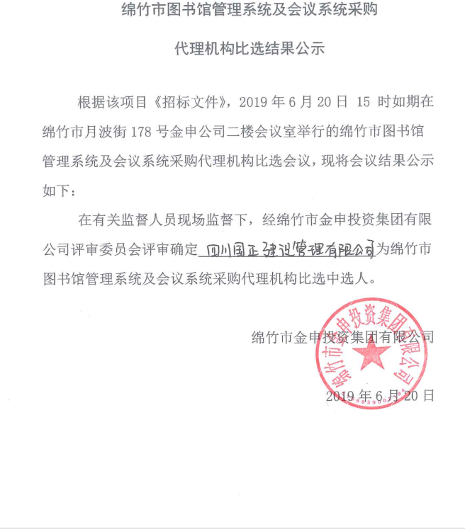 綿竹市圖書(shū)館管理系統及會(huì )議系統采購代理比選結果公示