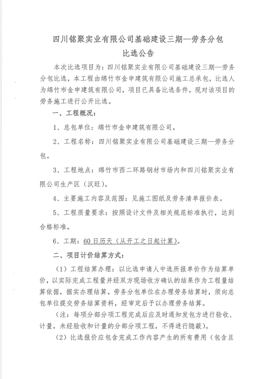 銘聚公司基礎建設三期—勞務(wù)分包比選公告