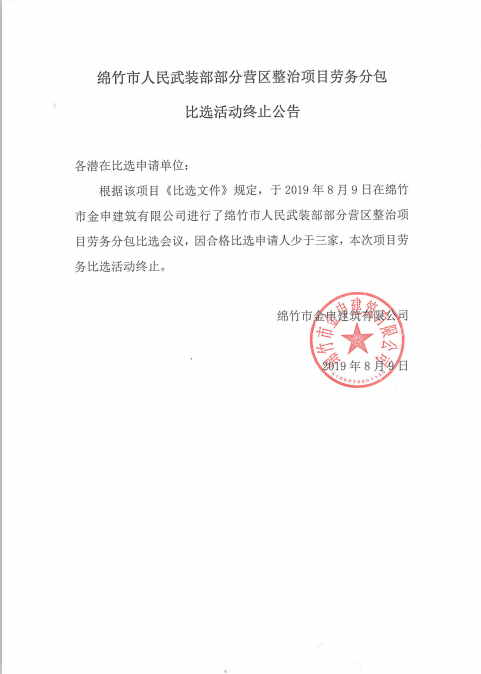 市武裝部部分營(yíng)區整治項目—勞務(wù)分包比選活動(dòng)終止公告