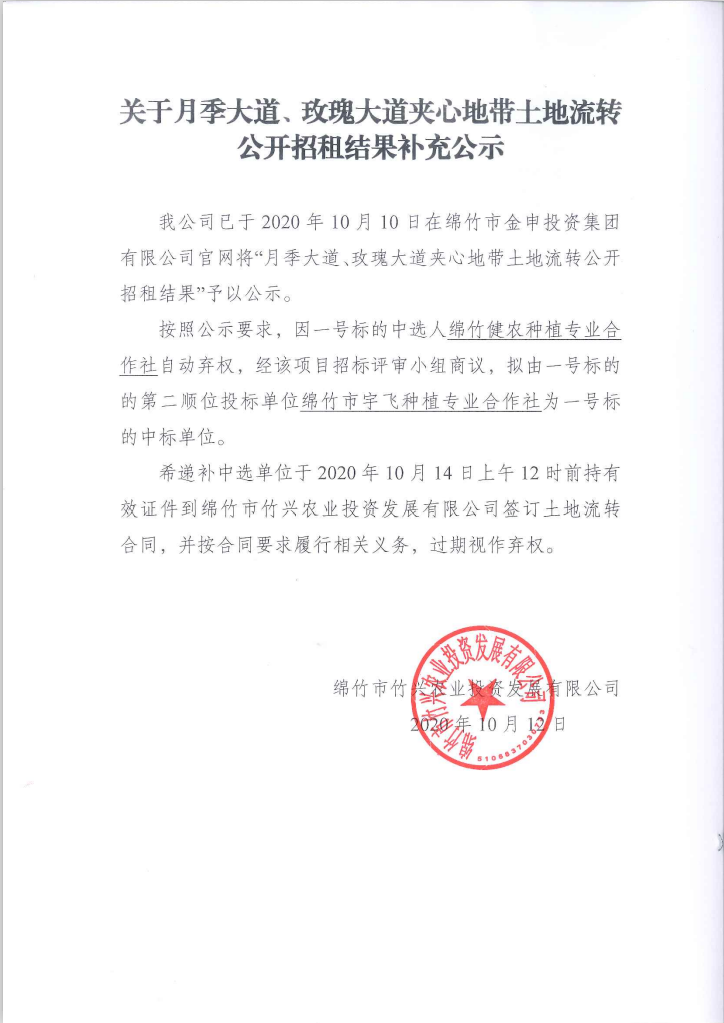 月季、玫瑰大道夾心地帶土地流轉公開(kāi)招租結果補充公示