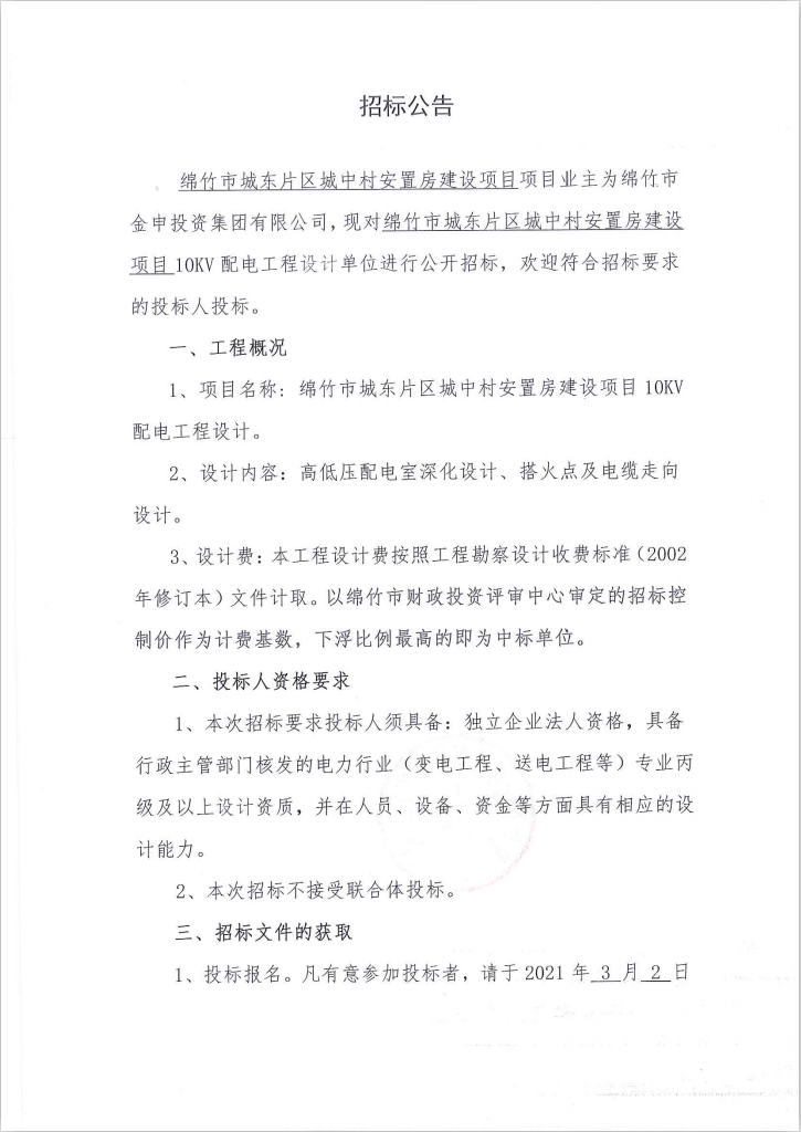 城東片區城中村安置房建設項目10KV配電工程設計招標公告