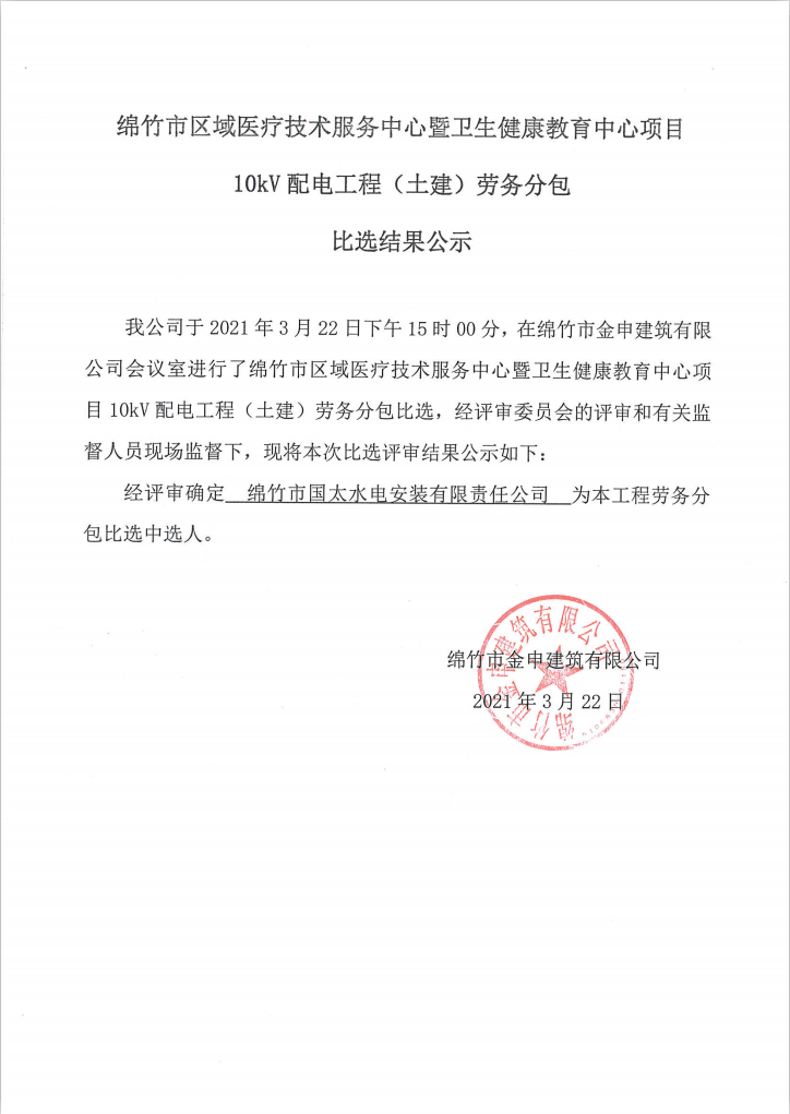 教育中心項目10KV配電工程(土建)勞務(wù)分包比選結果公告