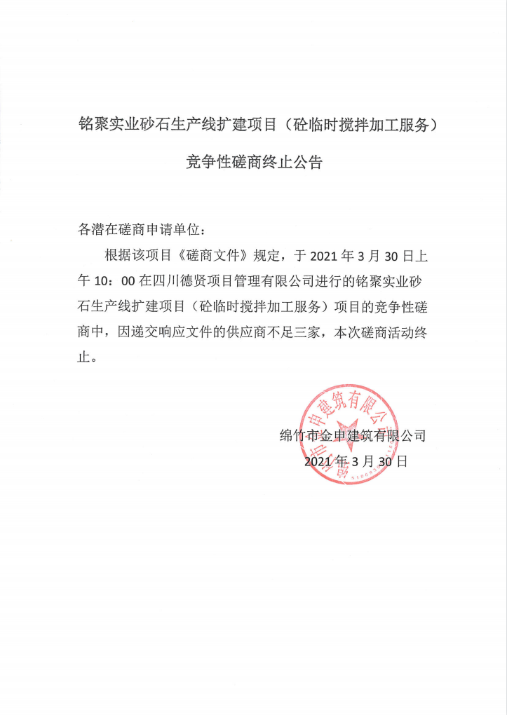 銘聚實(shí)業(yè)砂石生產(chǎn)線(xiàn)砼臨時(shí)攪拌加工競爭性磋商終止公告