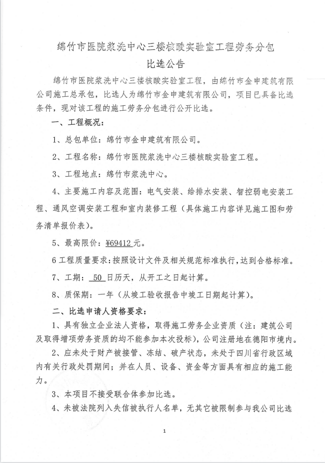 綿竹市醫院漿洗中心三樓核酸實(shí)驗室工程勞務(wù)分包比選公告