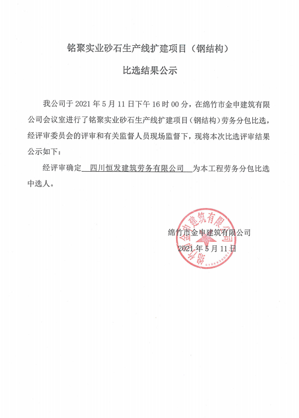 銘聚實(shí)業(yè)砂石生產(chǎn)線(xiàn)擴建項目(鋼結構)比選結果公示