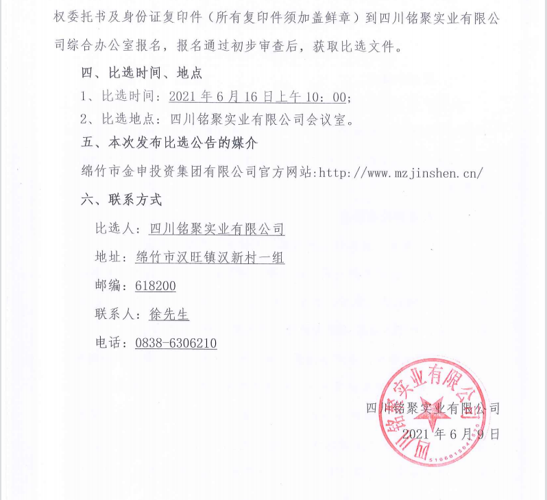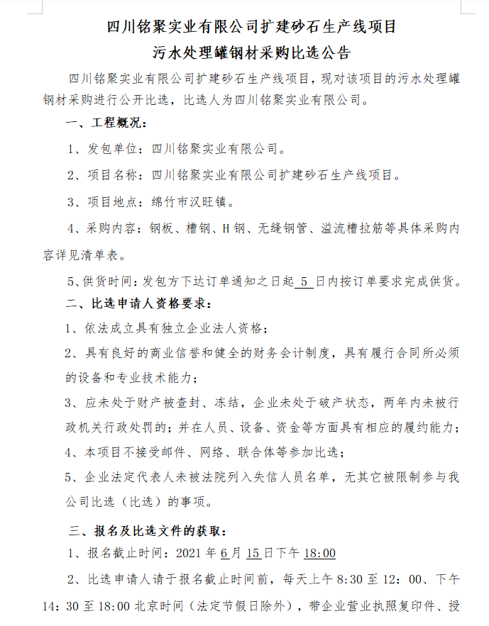 銘聚實(shí)業(yè)擴建砂石生產(chǎn)線(xiàn)項目污水處理罐鋼材采購比選公告