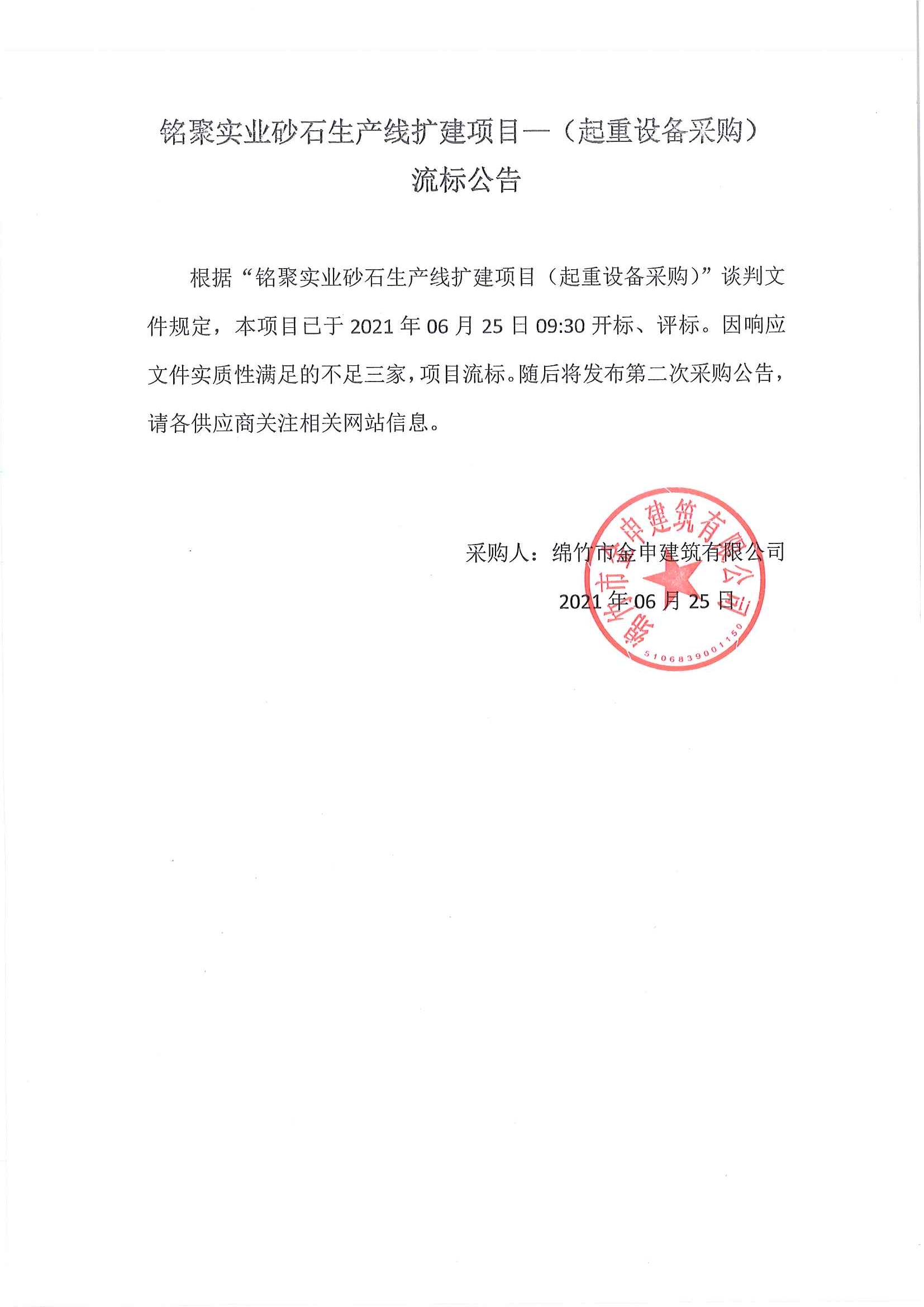 銘聚實(shí)業(yè)砂石生產(chǎn)線(xiàn)擴建項目-(起重設備采購)流標公告