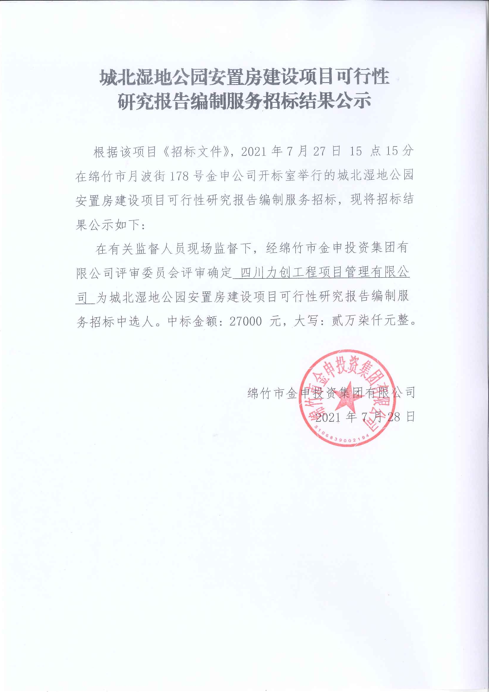 城北濕地公園安置房項目可研報告編制服務(wù)招標結果公示