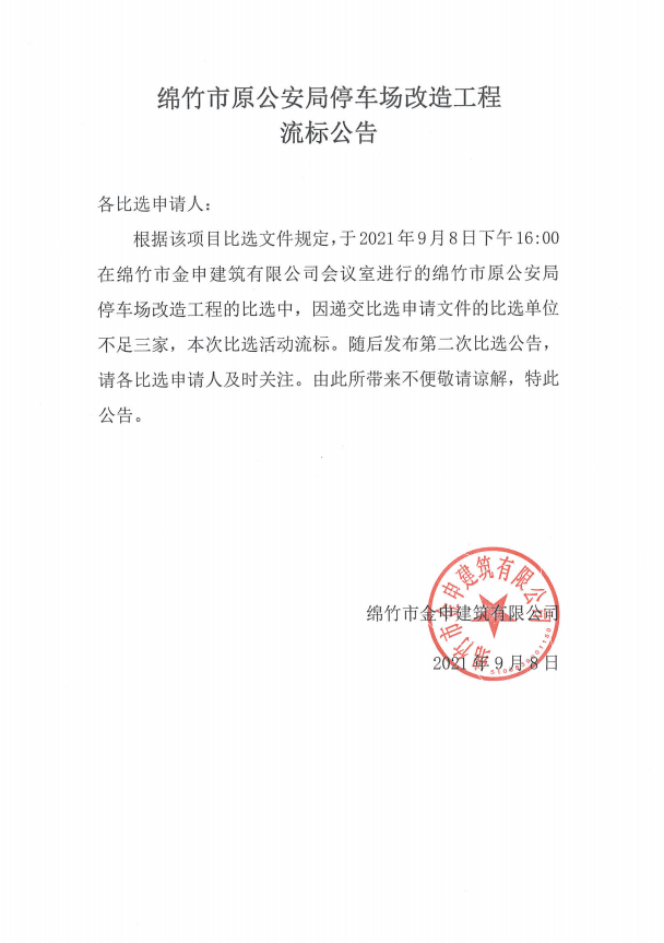 綿竹市原公安局停車(chē)場(chǎng)改造工程流標公告