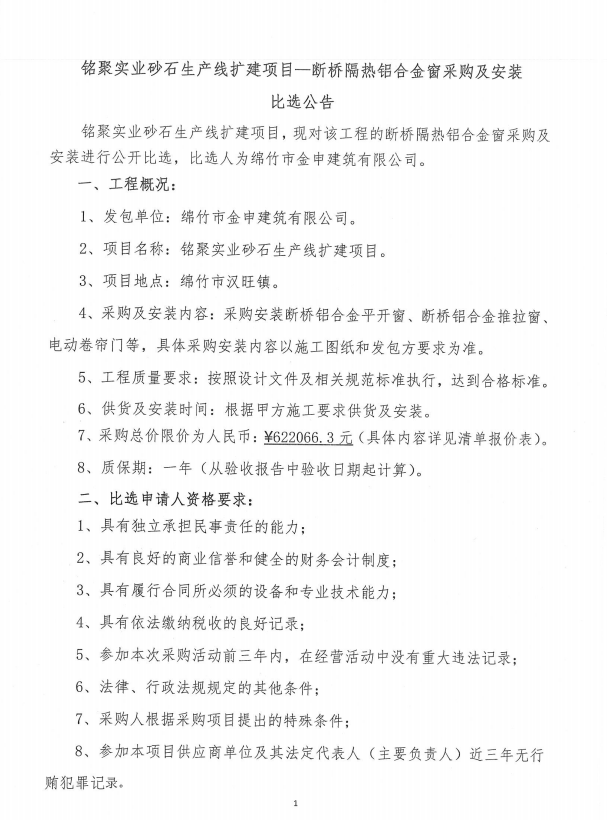 銘聚砂石生產(chǎn)線(xiàn)項目—斷橋隔熱鋁合金窗采購安裝比選公告
