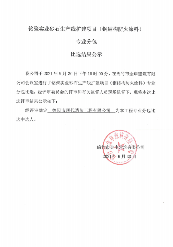 銘聚砂石生產(chǎn)線(xiàn)擴建項目(鋼結構防火涂料)比選結果公示
