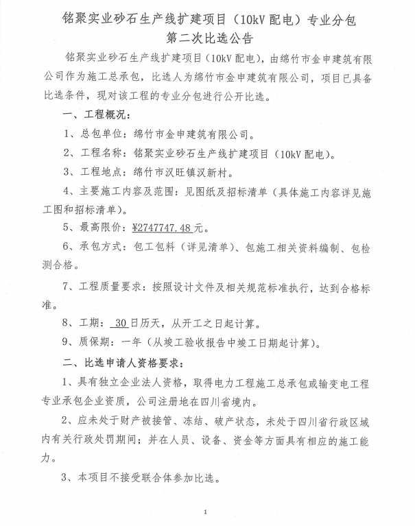 銘聚砂石生產(chǎn)線(xiàn)擴建項目(10kV配電)分包第二次比選公告