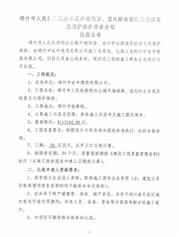 市檢察院外墻維修、室內防水等改造維修工程比選公告