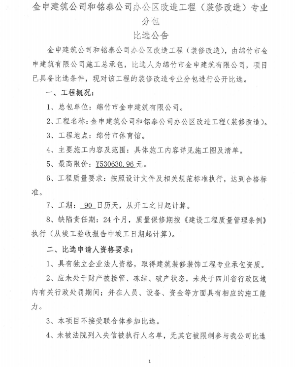 建筑和銘泰公司辦公區改造工程勞務(wù)分包比選公告