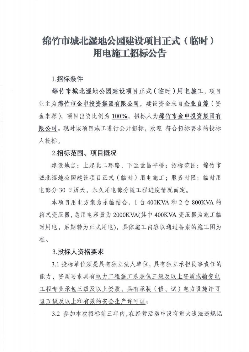 城北濕地公園建設項目正式(臨時(shí))用電施工招標公告